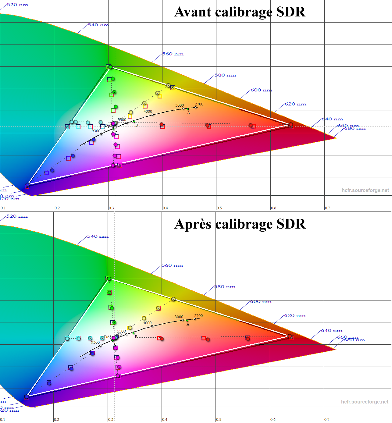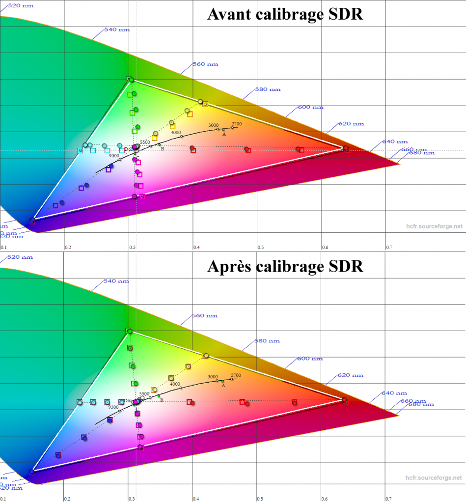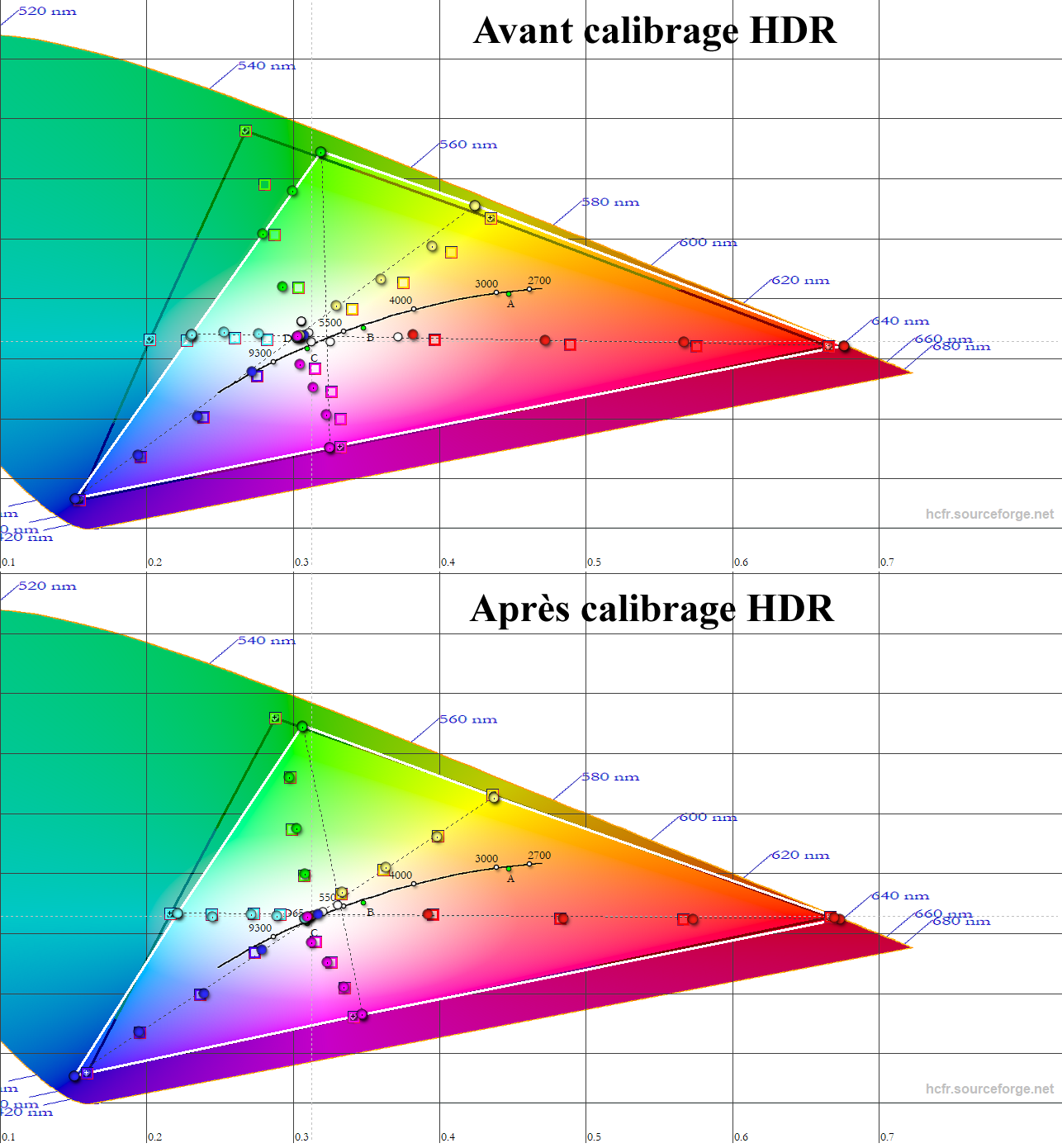 Avant calibrage HDR, le décalage du blanc impacte également le gamut. Il couvre une bonne partie de l’espace DCI-P3 sans atteindre les 100% de couverture.