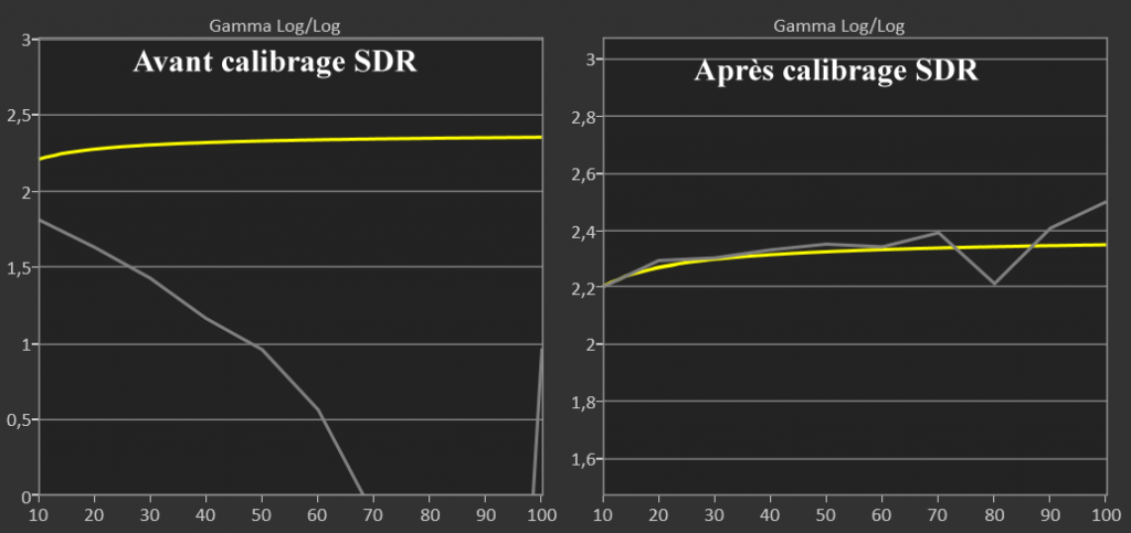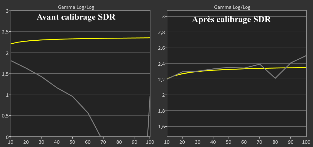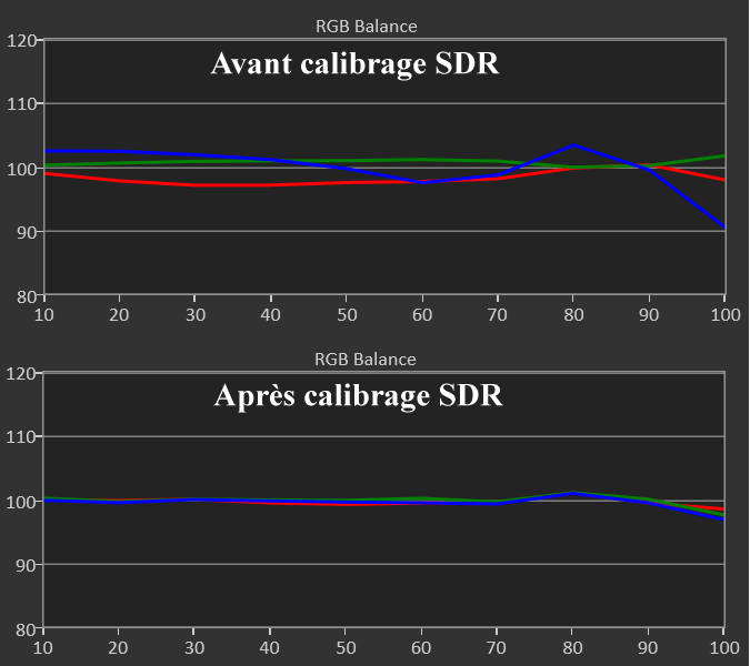 Après calibrage SDR, j’ai corrigé la balance des blancs après l’arrêt du contrôle dynamique du laser pour être conforme D65. Le delta E moy descend à 1 (max 2). J’ai placé le pic de luminance à 75 nits pour prendre en compte la taille de l’écran.