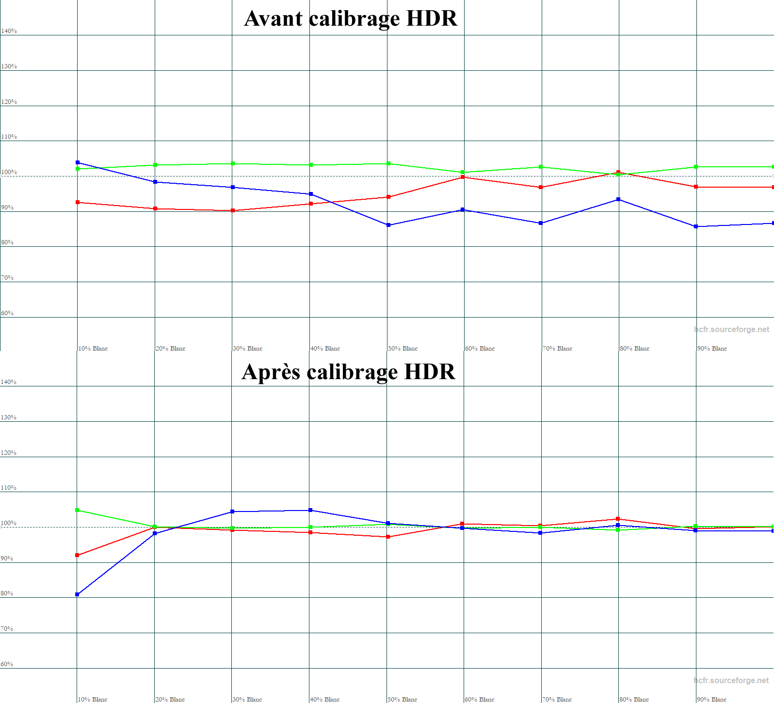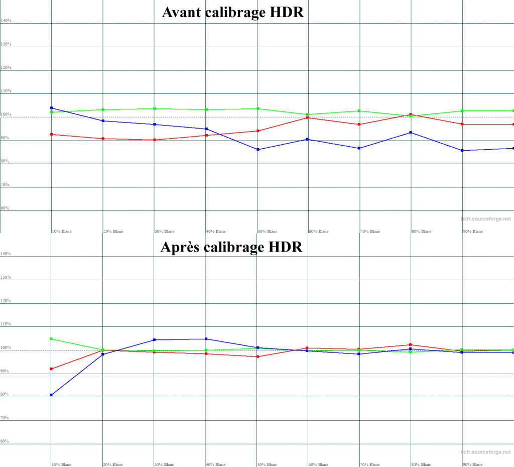 Avant calibrage HDR, la balance des blancs a un excès de vert. C’est ce qu’on retrouvait à l’image avec une teinte verdâtre. Cela booste la luminosité au détriment de la colorimétrie. Le pic de luminance (100% blanc) est à 155 nits sur la matrice « réduite » 16/9 du JVC, c’est à dire 3840 x 2160 et non pas 4096 x 2160. Le FrameAdapt limite le pic de luminance mesuré. En visionnage d’images réel, on aura plus en pic. Le 50% blancs est lui à 75 nits (FrameAdapt 1 en Auto Large), ce qui est trop haut. Plus le 50% se rapproche du 100%, plus cela castre le HDR qui a pour but l’affichage de détails lumineux dans les images. 𝗔𝘃𝗲𝗰 𝘂𝗻 𝟱𝟬% 𝗮𝘂𝘁𝗮𝗻𝘁 𝗿𝗲𝗺𝗼𝗻𝘁𝗲́, 𝗼𝗻 𝗲𝘀𝘁 𝗽𝗹𝘂𝘀 𝗽𝗿𝗼𝗰𝗵𝗲 𝗱’𝘂𝗻𝗲 𝗰𝗼𝗻𝘃𝗲𝗿𝘀𝗶𝗼𝗻 𝗛𝗗𝗥/𝗦𝗗𝗥 𝗾𝘂𝗲 𝗱’𝘂𝗻 𝗿𝗲́𝗲𝗹 𝗮𝗳𝗳𝗶𝗰𝗵𝗮𝗴𝗲 𝗛𝗗𝗥. Le delta E moy du blanc est à 6,3 (max 10,4).