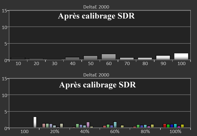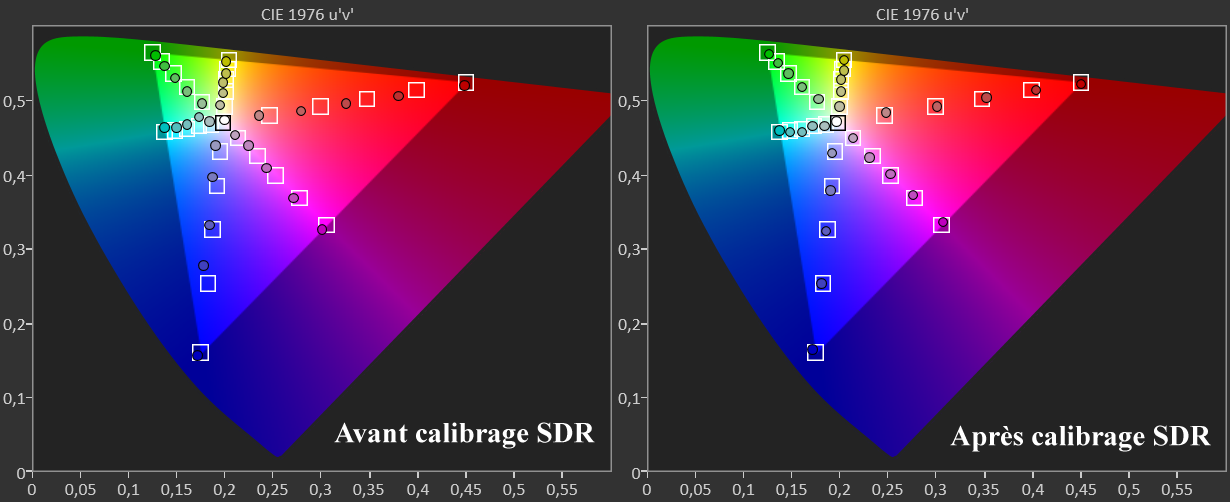 Après calibrage, le filtre permet aux couleurs de couvrir 100% du DCI-P3. Après les correctifs, j’obtiens un delta E moy à 1,4.