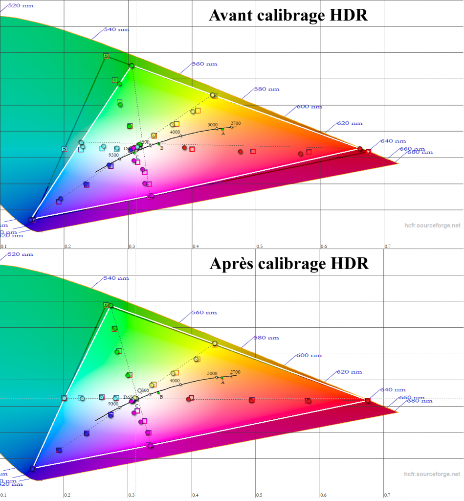 Avant calibrage HDR, les couleurs ont peu de dérives, mais avec un petit manque dans le vert et le rouge pour couvrir le DCI-P3. Si on ne tient pas compte de l’excès de luminosité, le delta E moy est à 3,3.
