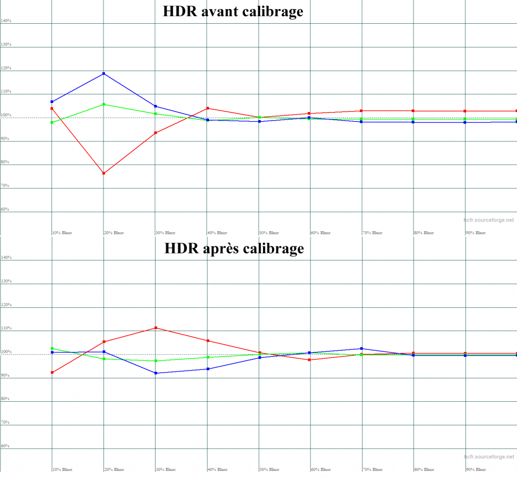 Pour le HDR, avant calibrage la balance des blancs n’était pas trop mal avec un Delta E moy à 1,3, mais un gros manque de luminosité avec seulement 79 nits en pic (100 nits minimum pour le HDR). Il fallait donc augmenter la lampe au maximum. Cependant les bancs sont brûlés dans la courbe de luminance est à revoir.