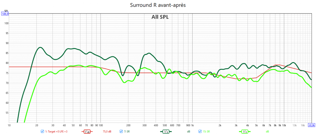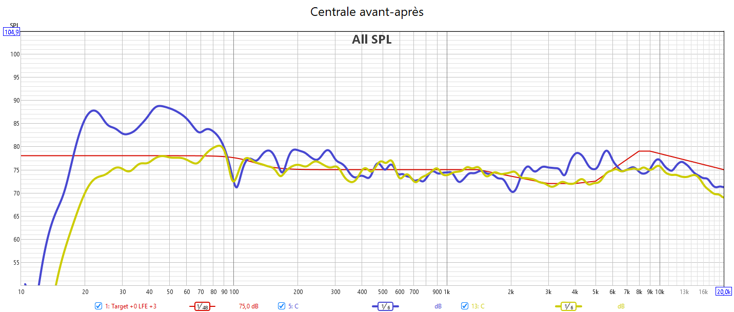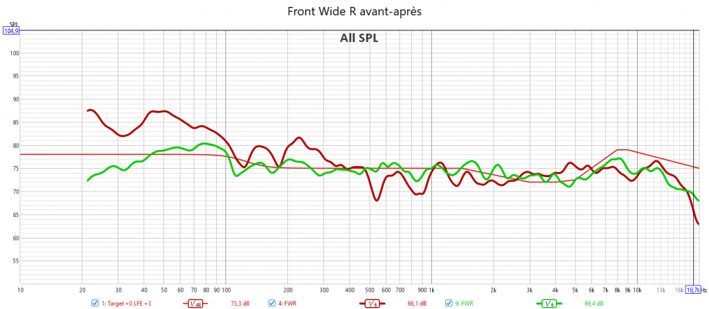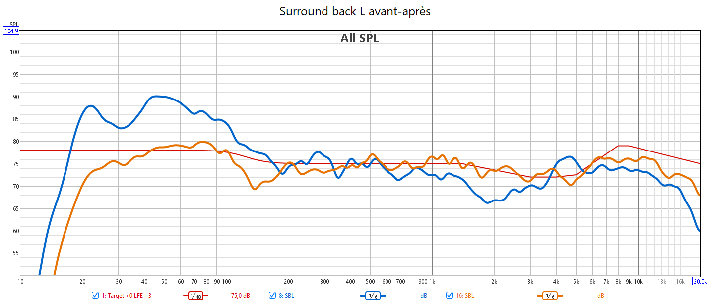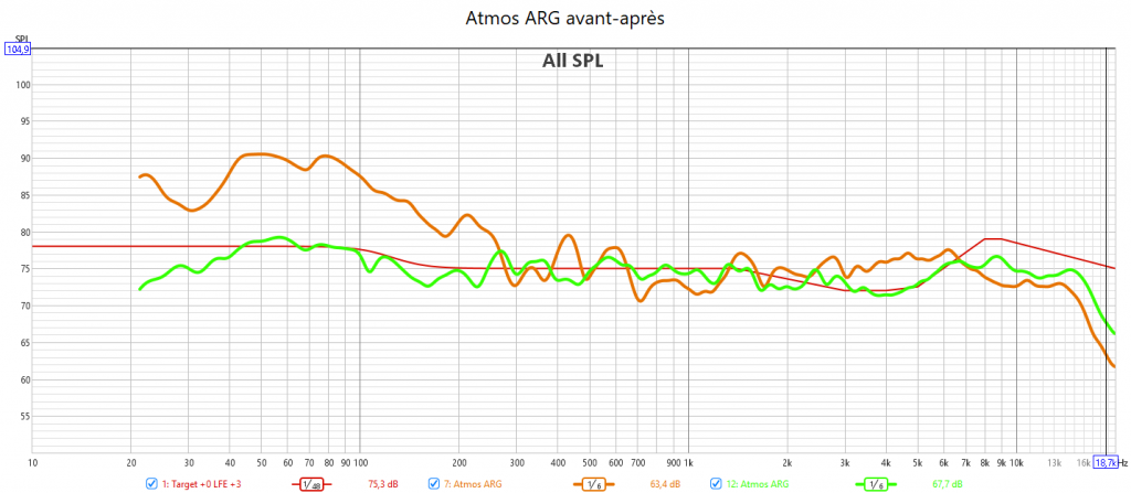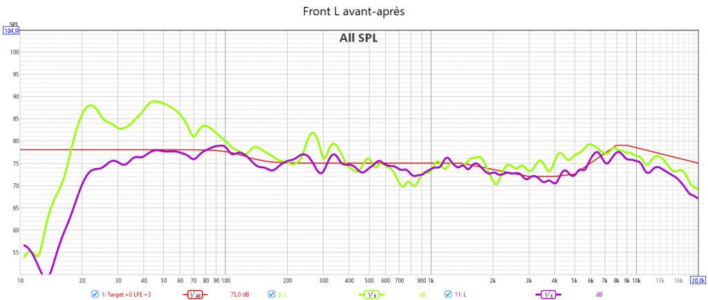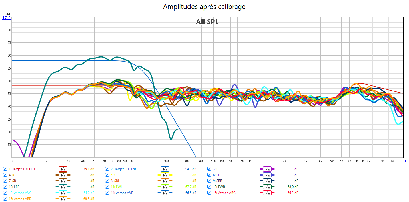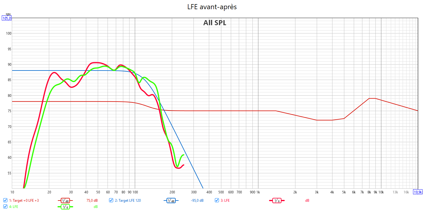 Après calibrage et avancement du point d’écoute pour le recentré, les amplitudes montrent une bien meilleure homogénéité avec le respect de la nouvelle courbe cible prenant en compte la sensibilité de l’oreille et l’alignement des niveaux sonores. 𝗖𝗲𝗹𝗮 𝗽𝗼𝘂𝗿 𝗮𝘀𝘀𝘂𝗿𝗲𝗿 𝗹’𝗲́𝗾𝘂𝗶𝗹𝗶𝗯𝗿𝗲 𝗱𝗲 𝗹𝗮 𝗯𝘂𝗹𝗹𝗲 𝘀𝗼𝗻𝗼𝗿𝗲 𝗮𝘃𝗲𝗰 𝗰𝗹𝗮𝗿𝘁𝗲́ 𝗲𝘁 𝘀𝗮𝗻𝘀 𝗮𝗴𝗿𝗲𝘀𝘀𝗶𝘃𝗶𝘁𝗲́. Je suis resté volontairement sous la courbe cible pour l’extrême aigu pour prendre en compte le niveau d’écoute élevé. 𝗟𝗮 𝗿𝗲́𝗽𝗼𝗻𝘀𝗲 𝗱𝘂 𝗟𝗙𝗘 𝗲𝘀𝘁 𝗮̀ 𝗹’𝗶𝗺𝗮𝗴𝗲 𝗱𝘂 𝗪𝗮𝘁𝗲𝗿𝗳𝗮𝗹𝗹 : 𝗯𝗶𝗲𝗻 𝗺𝗶𝗲𝘂𝘅 𝗲́𝗾𝘂𝗶𝗹𝗶𝗯𝗿𝗲́ 𝗽𝗼𝘂𝗿 𝘂𝗻 𝗴𝗿𝗮𝘃𝗲 𝗽𝗿𝗼𝗽𝗿𝗲 𝗲𝘁 𝗻𝘂𝗮𝗻𝗰𝗲́. J’ai pu obtenir une bonne précision en utilisant les PEQ de l’ampli Yamaha PX8.
