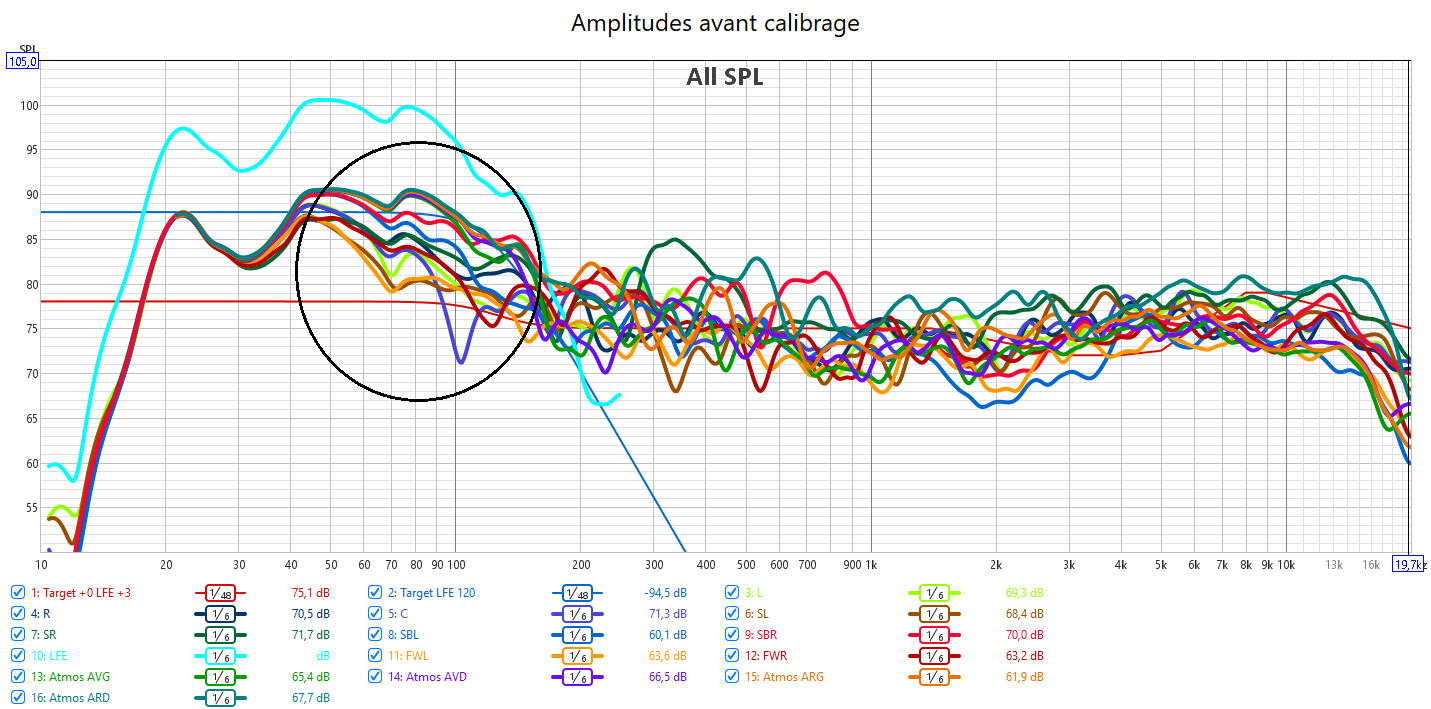 Avant calibrage, les mesures en amplitude montrent un manque d’équilibre et d’homogénéité dans les réponses. Cela pénalise obligatoirement l’équilibre de la bulle sonore. Il y a trop de disparités entre les enceintes. Aussi dans les niveaux sonores. Ce qui va rendre localisables certaines enceintes. Et on ne le souhaite pas. 𝗢𝗻 𝘀𝗼𝘂𝗵𝗮𝗶𝘁𝗲 𝗹𝗼𝗰𝗮𝗹𝗶𝘀𝗲𝗿 𝗹𝗲𝘀 𝗲𝗳𝗳𝗲𝘁𝘀 𝘀𝗼𝗻𝗼𝗿𝗲𝘀, 𝗖’𝗲𝘀𝘁 𝘁𝗿𝗲̀𝘀 𝗱𝗶𝗳𝗳𝗲́𝗿𝗲𝗻𝘁. Le LFE est sur-dosé avec un manque d’équilibre qui se visualise bien sur le Waterfall. 𝗟𝗲 𝗽𝗶𝗰 𝗮̀ 𝟮𝟮𝗛𝘇 𝗽𝗲𝘂𝘁 𝗲̂𝘁𝗿𝗲 𝗳𝗹𝗮𝘁𝘁𝗲𝘂𝗿 𝘀𝘂𝗿 𝗹𝗲 𝗿𝗲𝗻𝗱𝘂, 𝗺𝗮𝗶𝘀 𝗻𝘂𝗶𝘁 𝗮̀ 𝗹𝗮 𝗰𝗼𝗵𝗲́𝗿𝗲𝗻𝗰𝗲 et à la bonne nuance du grave.