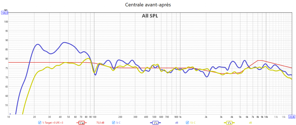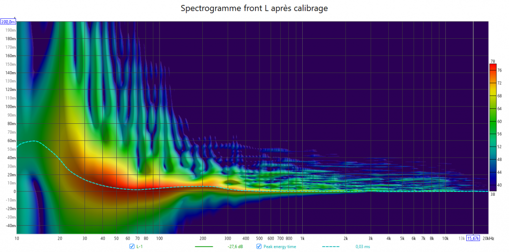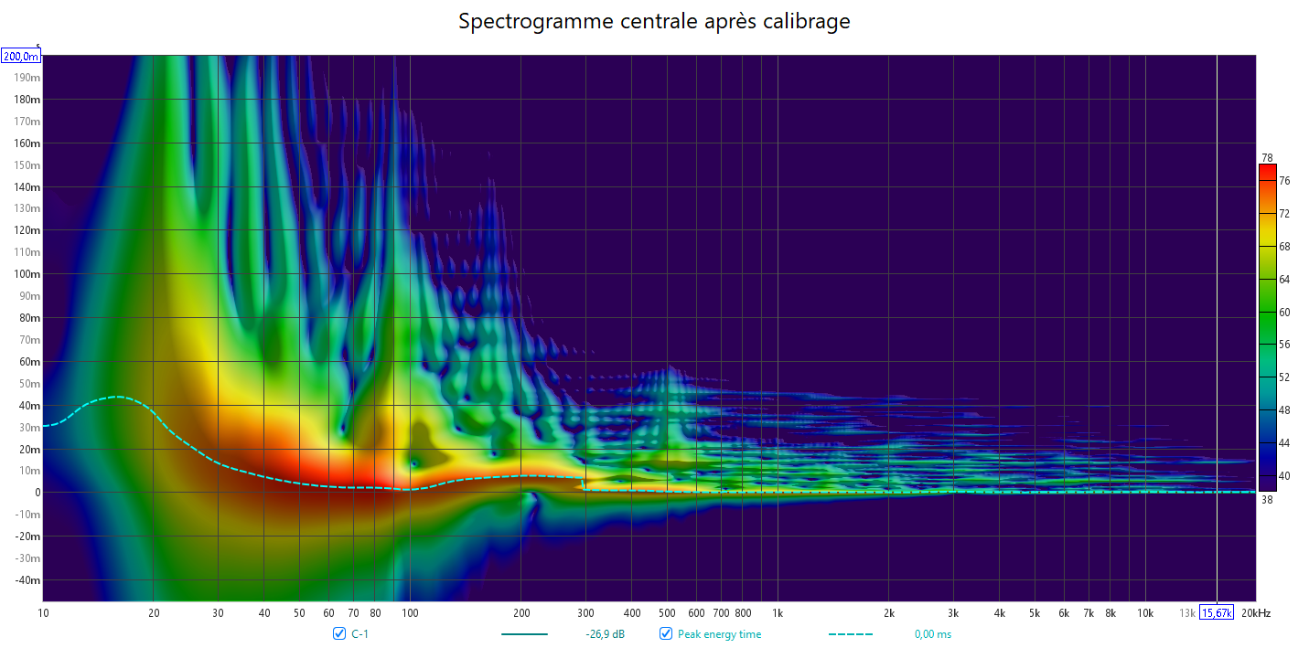 Après calibrage, J’ai compensé le retard du LFE pour ensuite optimiser le bass-management. Tout cela se constate sur les relevés de temps groupe et ici le spectrogramme de la centrale. Elle se comporte légèrement différemment des front L et R entre 100 et 300 Hz à cause de leur position. L et R sont proche d’un coin, pas la centrale.