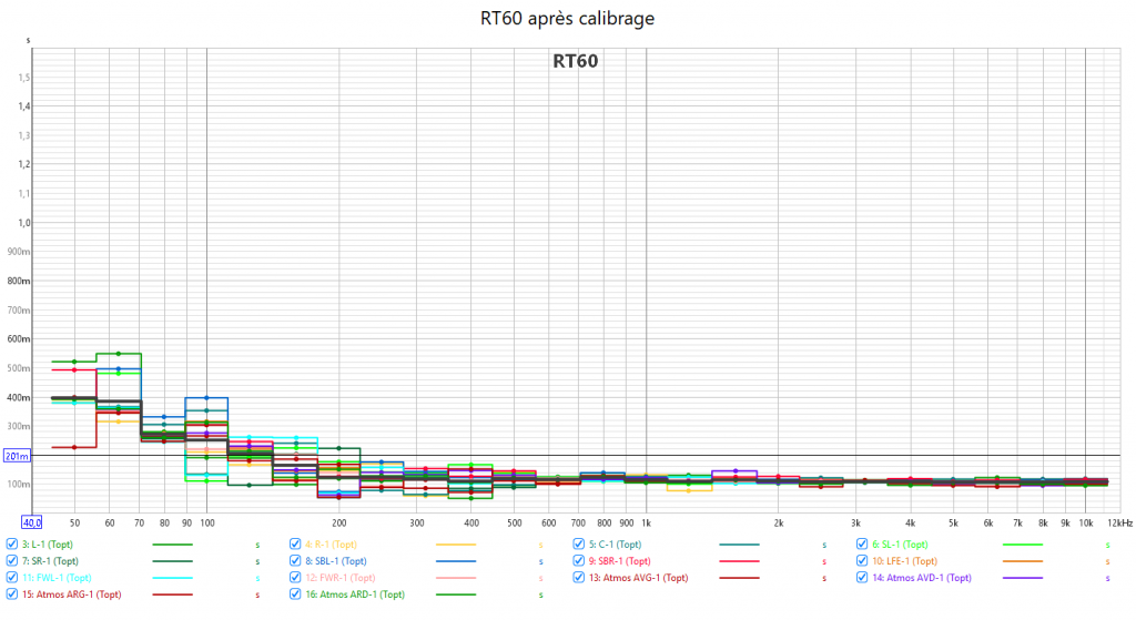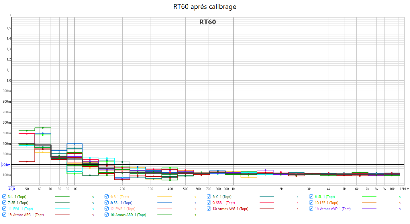 Le traitement acoustique de la pièce est assez bon. Le RT60 (temps de réverbération) est en grande partie à 100ms. C’est vraiment la fourchette basse. Le grave étant toujours plus compliqué, le RT60 remonte sous les 200 Hz jusqu’à 400 ms à 50 Hz qui reste très acceptable et ne pénalise pas le rendu du grave, ce que confirment les écoutes finales.