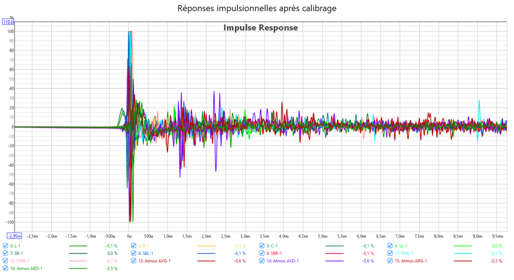 La réponse impulsionnelle est déjà bonne grâce à une pièce (et au point d’écoute) très bonne pour le grave. 𝗣𝗮𝗿 𝗰𝗼𝗻𝘁𝗿𝗲 𝗹𝗲 𝗯𝗮𝘀𝘀-𝗺𝗮𝗻𝗮𝗴𝗲𝗺𝗲𝗻𝘁 𝗲𝘀𝘁 𝗮̀ 𝗿𝗲𝘃𝗼𝗶𝗿 : entre 40 et 160 Hz, aucun canal ne sort le même niveau sonore. La clarté n’est pas trop mal, mais perfectible. Et certaines fréquences dans l’aigu (2-5 kHz) peuvent être trop marquées.