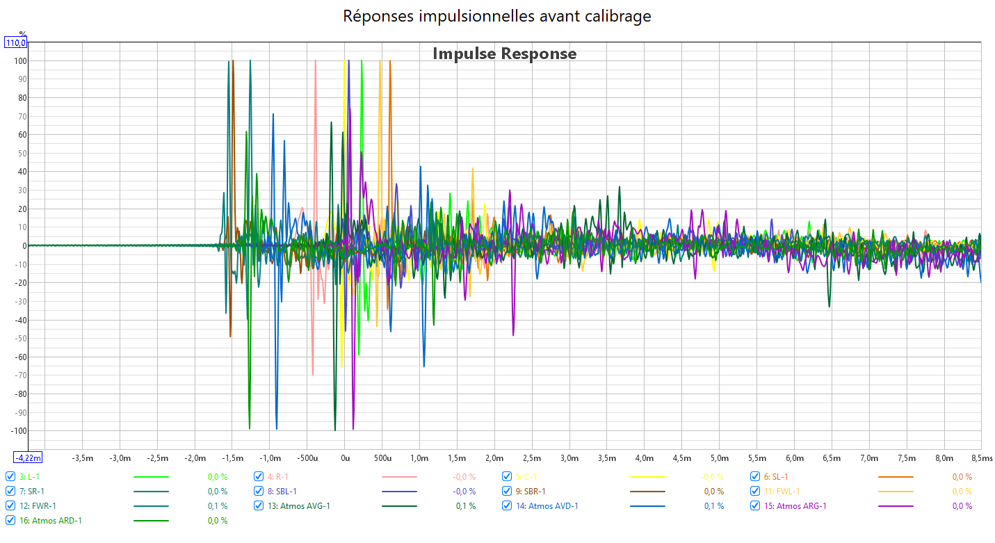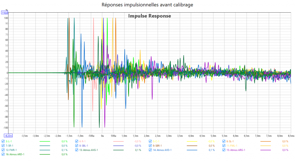 Avant calibrage, on visualise le retard habituel du LFE : environ 20ms, bien visible ici et aussi sur le spectrogramme de la centrale. Audyssey ne sait pas le corriger. Il faut des distances bien supérieur à la distance réel.