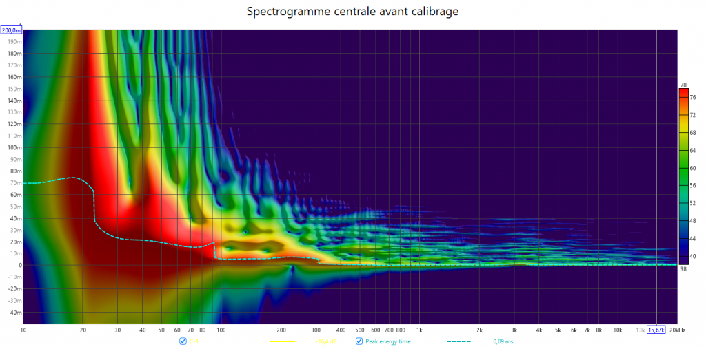 Avant calibrage, le spectrogramme du canal centrale montre l’habituel retard du LFE : environ 20ms. Et aussi son sur dosage. Audyssey ne sait pas le corriger. Il faut des distances bien supérieur à la distance réel.