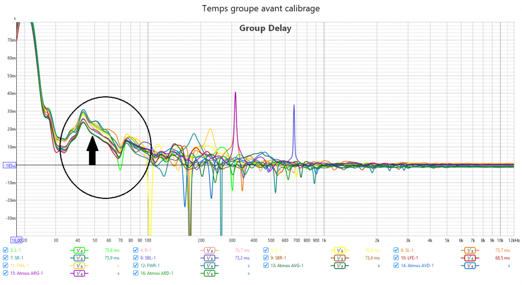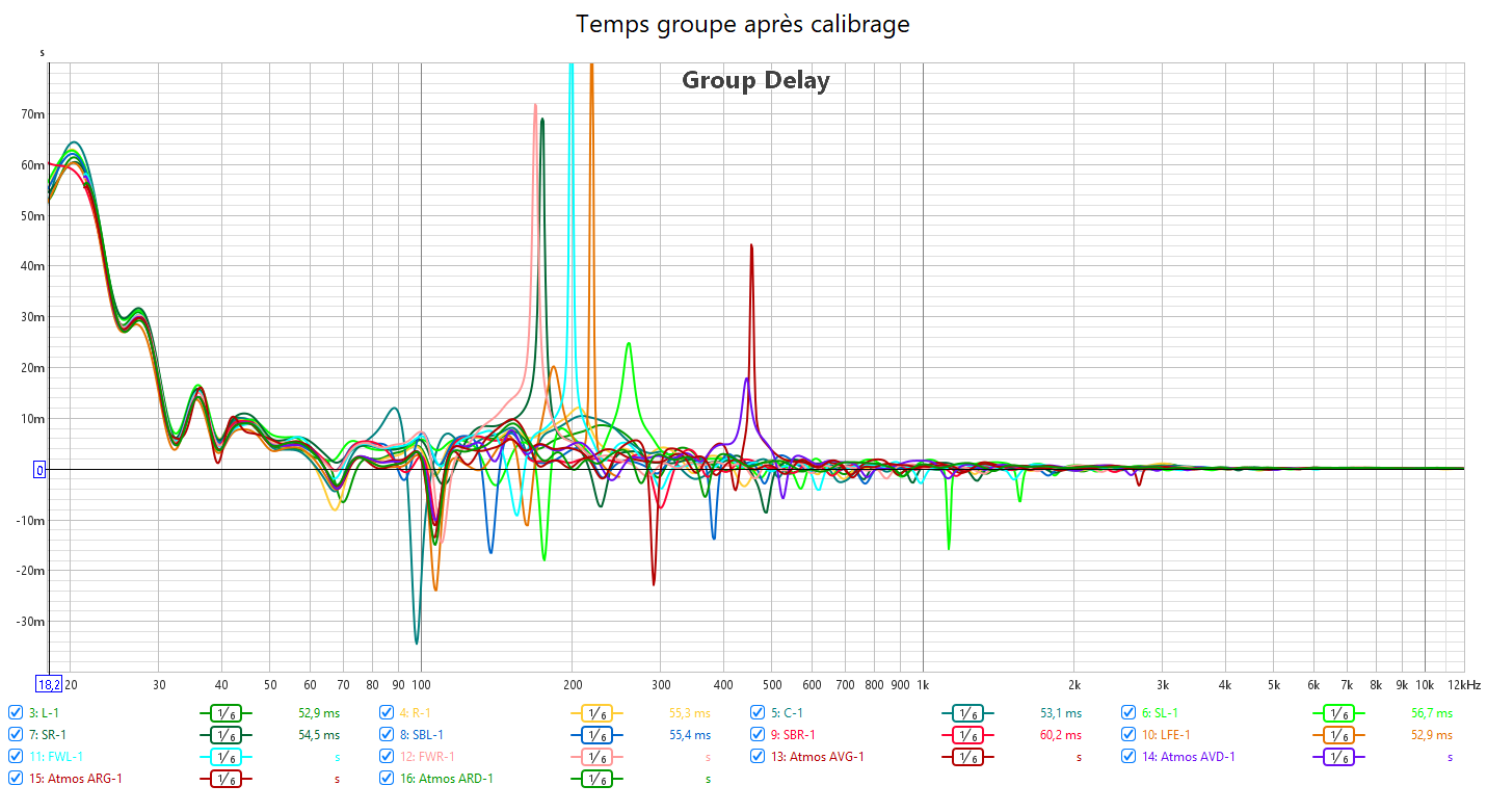 Après calibrage, J’ai compensé le retard du LFE pour ensuite optimiser le bass-management. Tout cela se constate sur les relevés de temps groupe et le spectrogramme de la centrale.