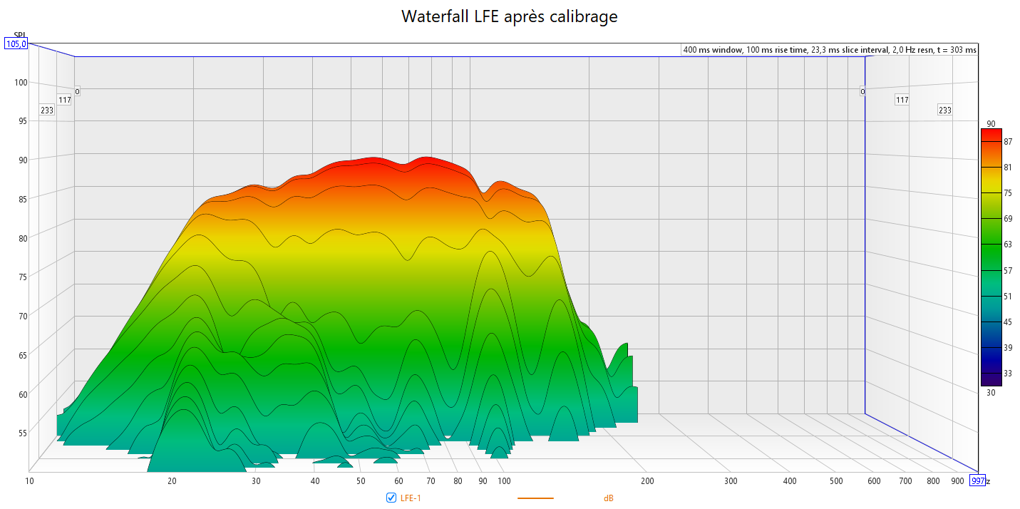 Voici la correction correction avec Audyssey et les PEQ de l’ampli Yamaha PX8 du canal LFE. Le Waterfall montre le réel équilibre de la réponse.