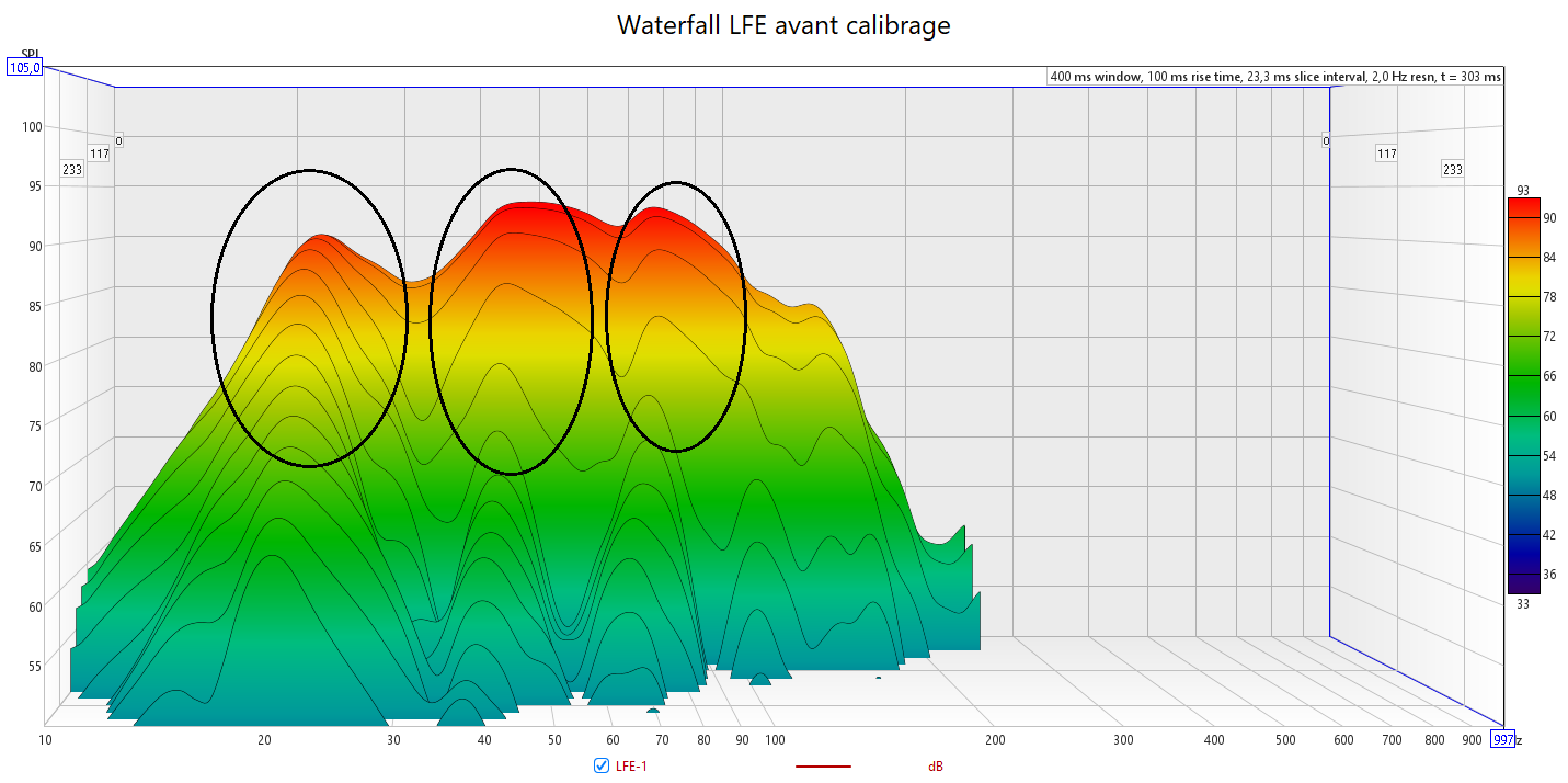 Waterfall du LFE avant calibrage : Le LFE est sur-dosé avec un manque d’équilibre qui se visualise bien ici avec les pics entourés. Le pic à 22 Hz peut être flatteur sur le rendu, mais nuit à la cohérence et à la bonne nuance du grave.