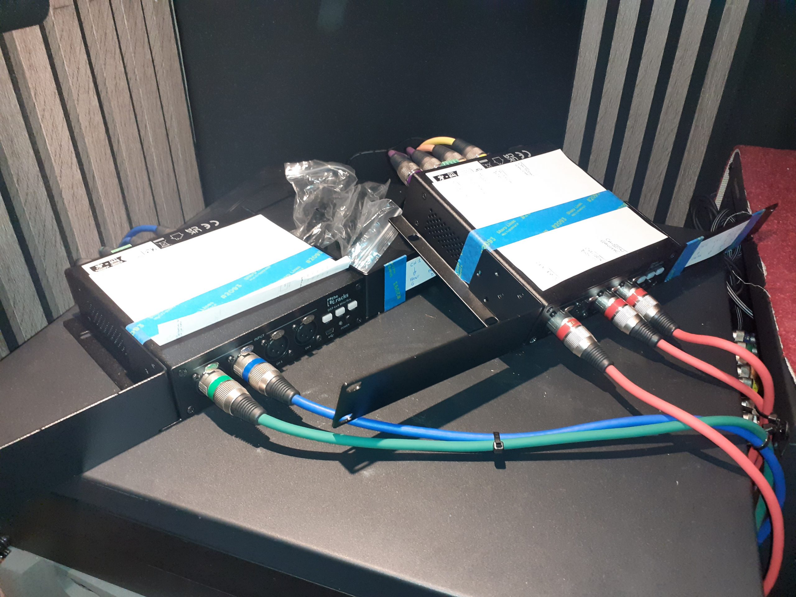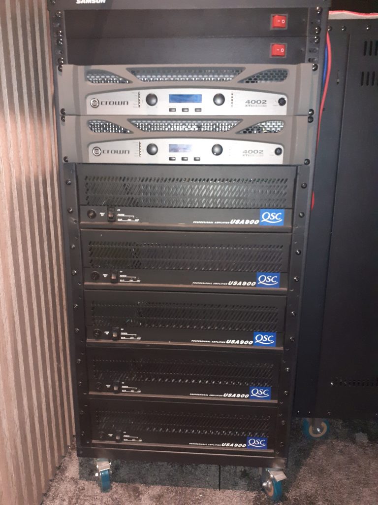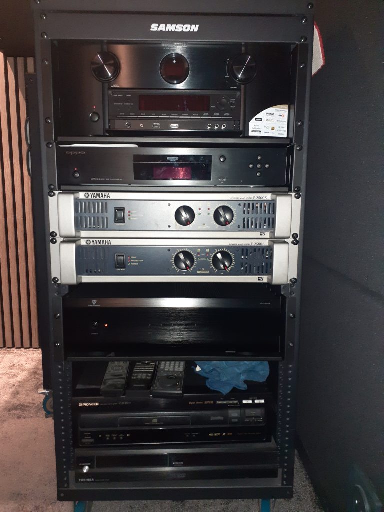 La scène frontale se compose de 3 grosses bibliothèques, des KCS S-2001. Leur fréquence basse : 50Hz. 𝗜𝗹 𝗻𝗲 𝘀𝗲𝗿𝘁 𝗮̀ 𝗿𝗶𝗲𝗻 𝗱𝗲 𝗱𝗲𝘀𝗰𝗲𝗻𝗱𝗿𝗲 𝗽𝗹𝘂𝘀 𝗯𝗮𝘀 𝗲𝗻 𝗳𝗿𝗲́𝗾𝘂𝗲𝗻𝗰𝗲. 𝗟𝗲𝘀 𝗰𝗮𝗶𝘀𝘀𝗼𝗻𝘀 𝘀𝗼𝗻𝘁 𝗹𝗮̀ 𝗽𝗼𝘂𝗿 𝗳𝗮𝗶𝗿𝗲 𝗹𝗲 𝗷𝗼𝗯. C’est pour cela que je répète que les colonnes ne sont pas du tout obligatoires en utilisation HC (attention au marketing). Non filtrées avant ma venue, 2 DSP t.racks mini 4×4 Pro vont être utilisés pour le filtrage actif des KCS. 5 amplis QSC USA900 sont présents pour alimenter cette scène frontale dont 3 sont bridgés. Les Crown XTi4002 alimentent les 2 caissons JBL 4642A (4 x 46cm). 2 amplis Yamaha P2500S alimentent les 4 surround confiées à des KCS SR8. L’ampli Tonewinner AD5100 alimente les atmos Klipsch Pro-180RPC.