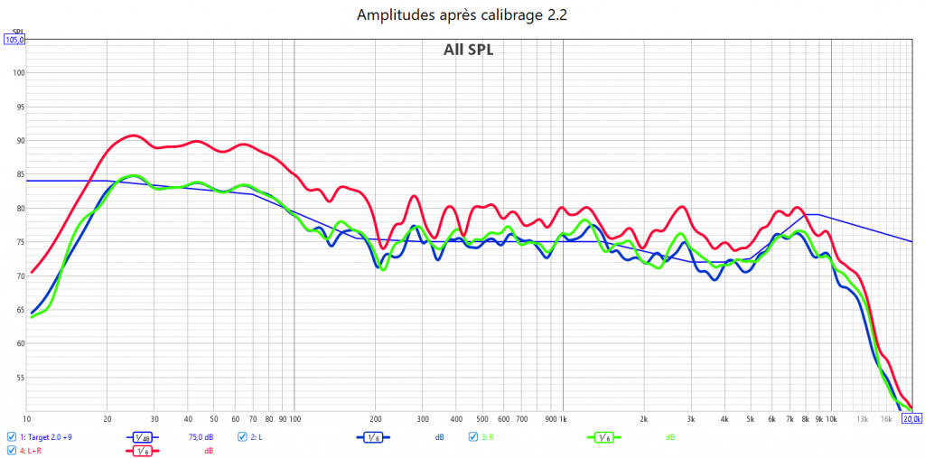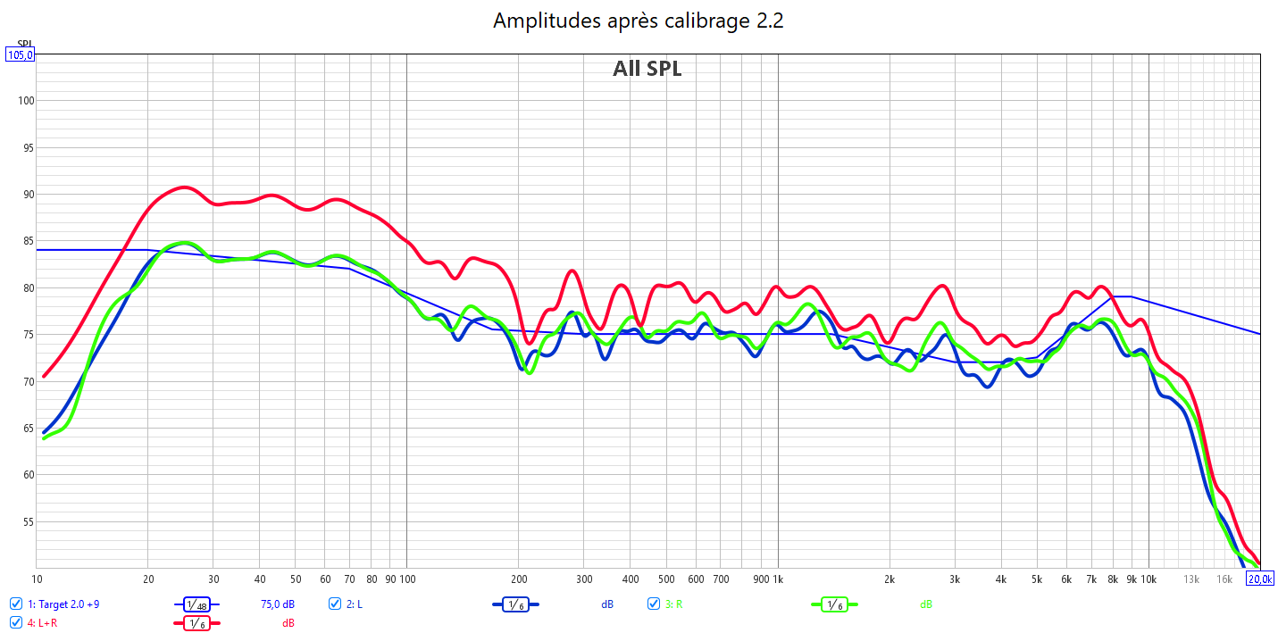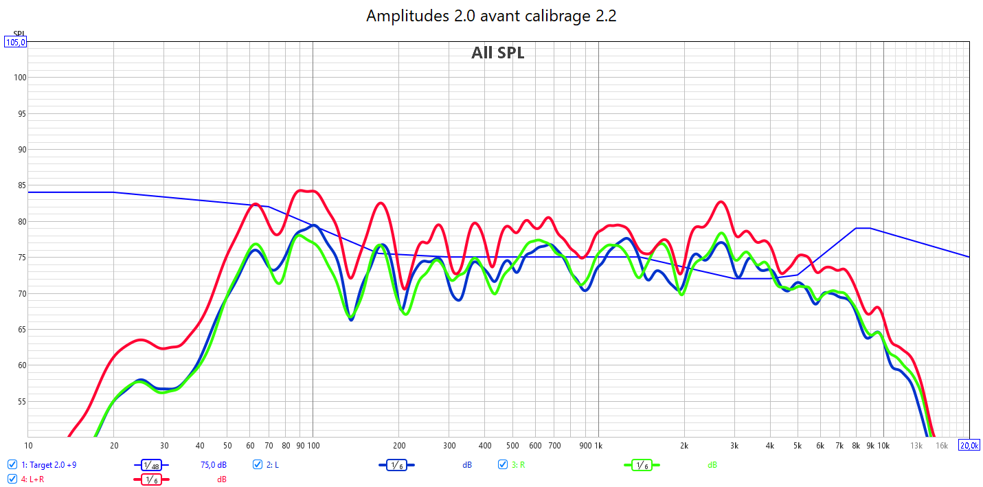 Voici les amplitudes 2.0 avant calibrage 2.2 des KCS S-2001 droite et gauche tout juste aligné avec le filtrage actif (t.rack DSP mini 4×4 Pro).