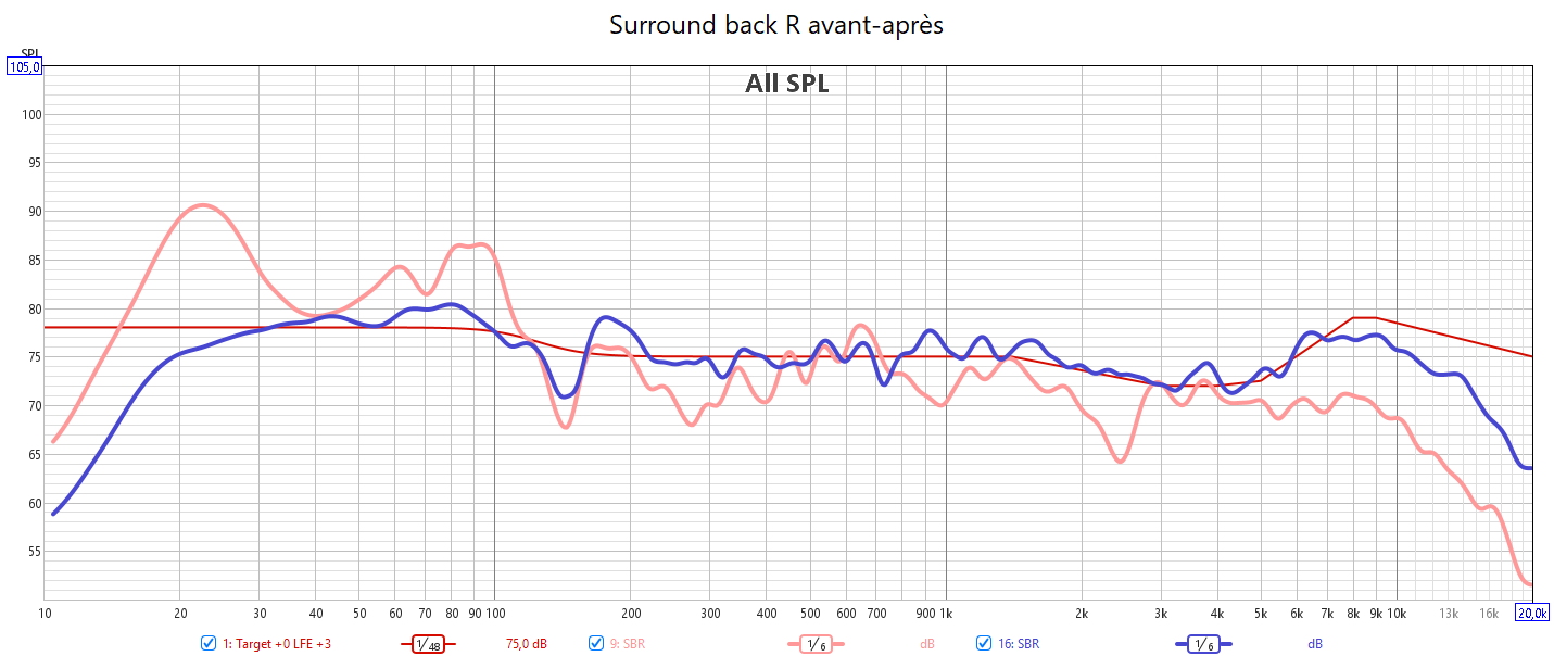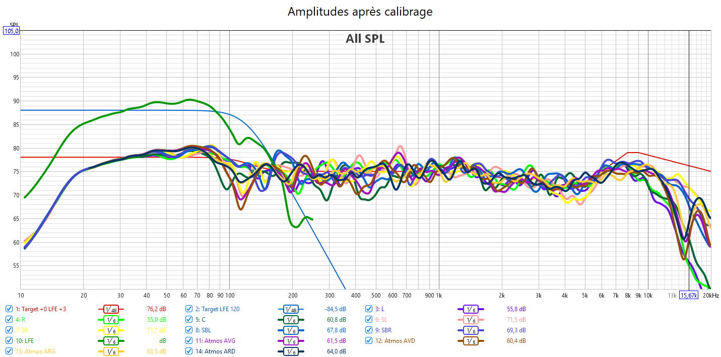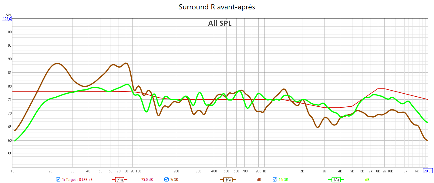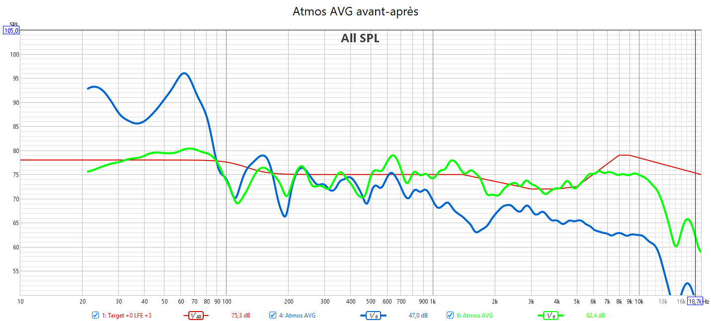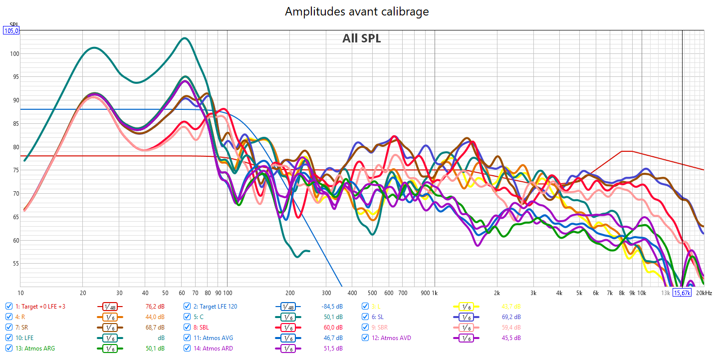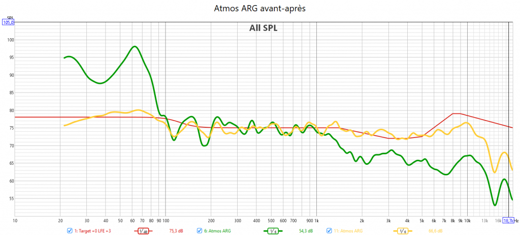Après la calibrage Audyssey. C’est mieux qu’avant, mais il y a toujours des fréquences assez marquées dans le rendu sonore. L’équilibre est perfectible pour mieux nuancer le grave.
