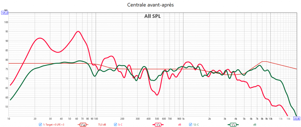 Voici la correction du canal centrale avec le filtrage actif du DSP t.racks de l’enceinte puis avec Audyssey.