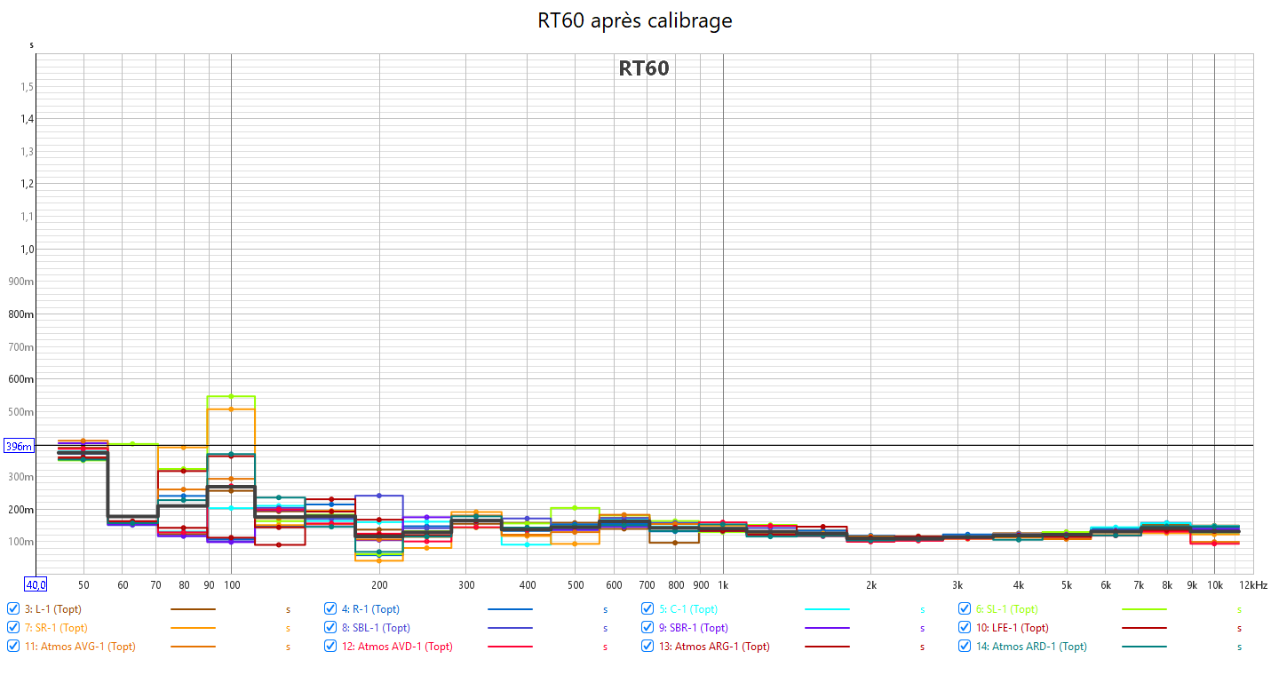 Après calibrage, le spectrogramme de la centrale montre bien la compensation du retard du LFE (en augmentant sa distance). La centrale se comporte différemment vers les 100Hz que les canaux droite et gauche. Ils n’ont pas le défaut visible sur le graph. Si le RT60 est bon, l’acoustique de la pièce reste perfectible, car c’est bien un problème d’acoustique lié au point d’écoute.