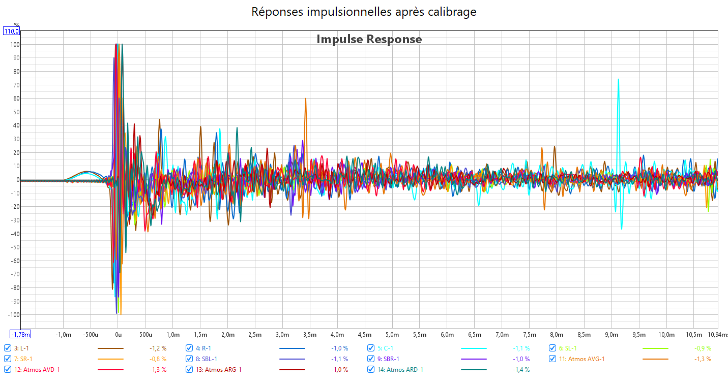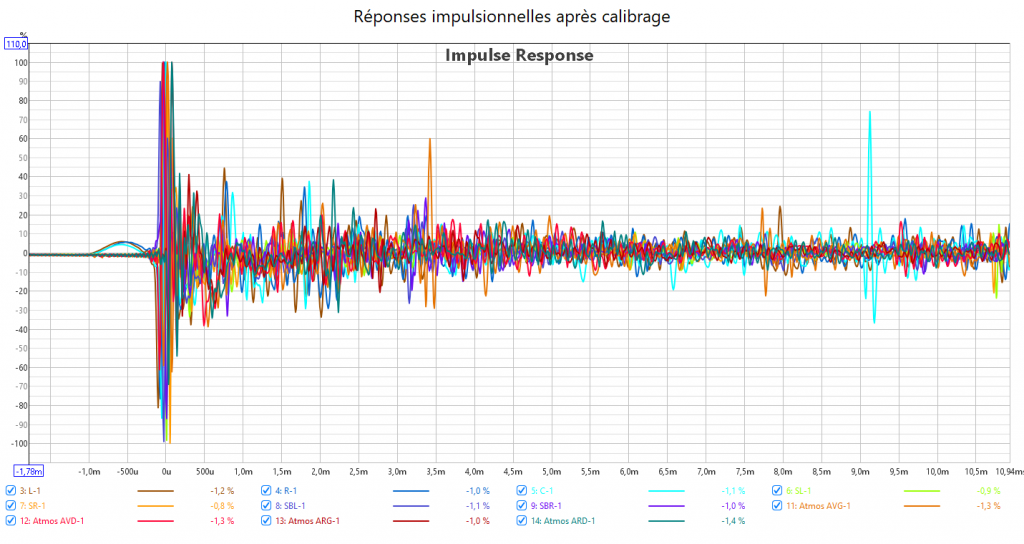 Après calibrage, J’ai ajusté l’alignement temporel des enceintes dans une fourchette inférieur à 0,5ms.