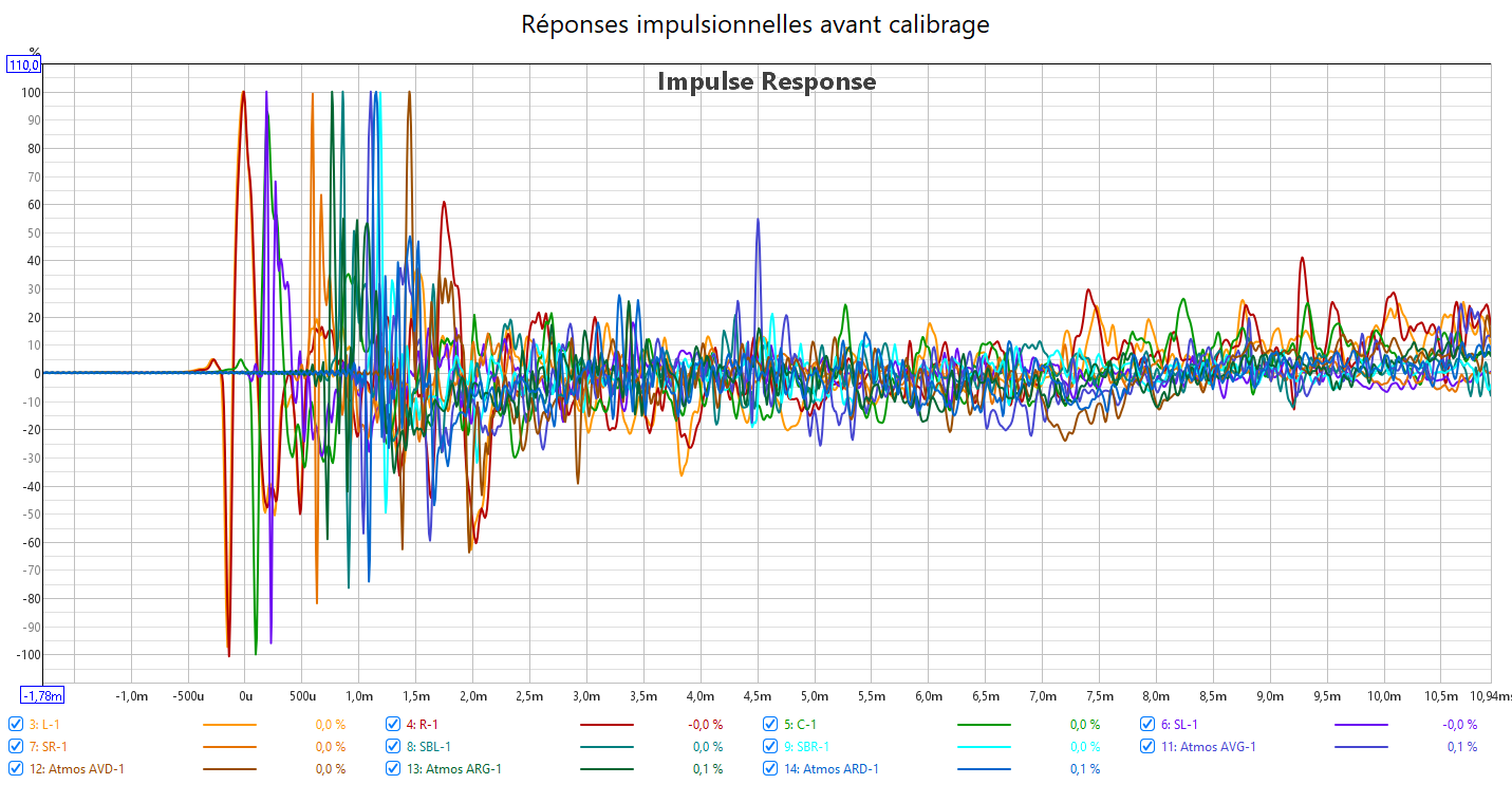 Avant calibrage, le calage temporel des enceintes se tient dans une fourchette d’1,5 millisecondes. C’est perfectible, surtout le retard du LFE d’environ 20ms. Un classique que la majorité des systèmes de calibrage automatique ne savent pas corriger.