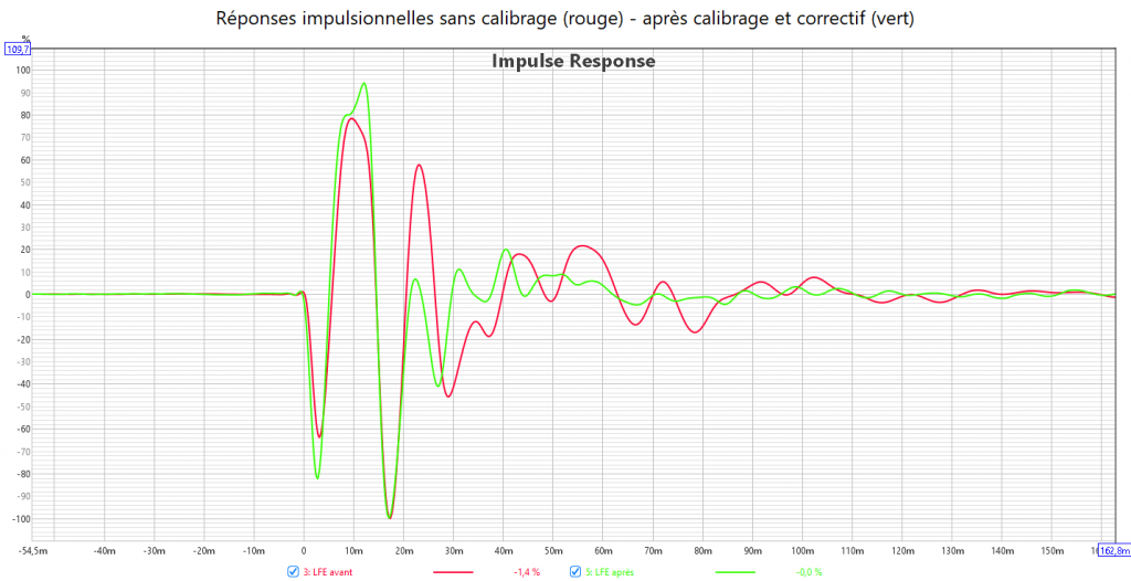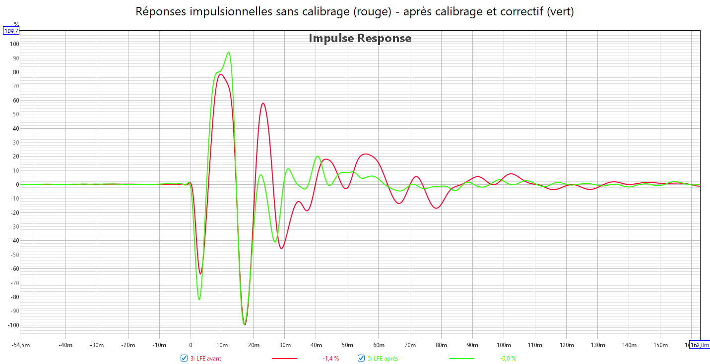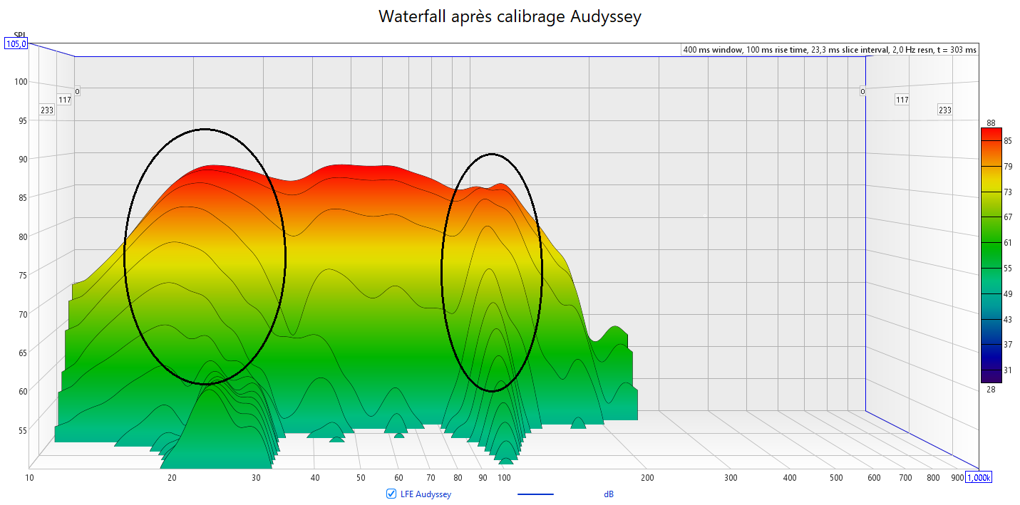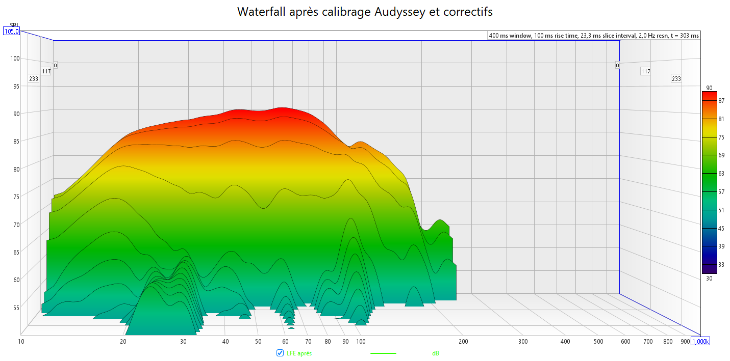 On peut constater la bonne évolution de la réponse impulsionnelle du LFE avant-après calibrage. C’est lié aussi à la bonne évolution du waterfall ci-dessous.