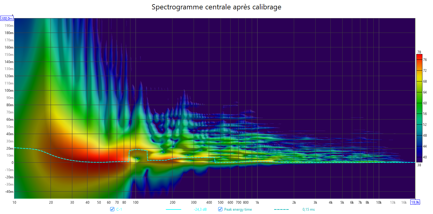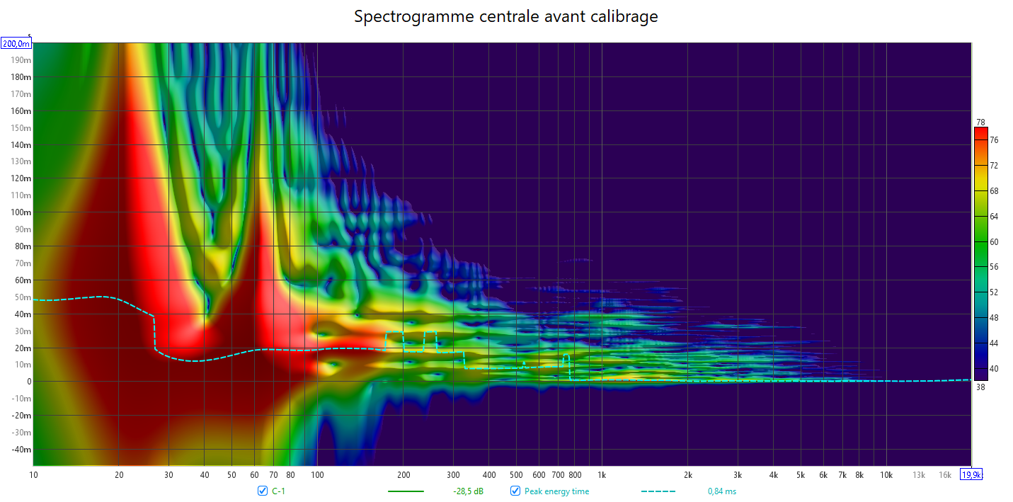 Avant calibrage, le spectrogramme de la centrale est vraiment pas bon avec du retard dans le haut grave / bas médium lié à l’absence de filtrage actif. Le retard du bas grave est lié à celui du LFE.
