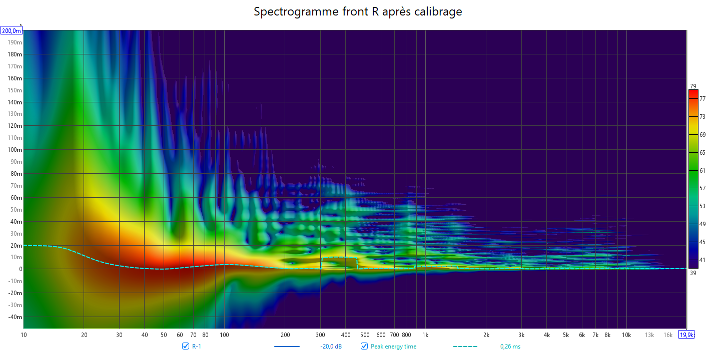 Le spectrogramme de la frontale droite montre l’absence du défaut à 100Hz qu’on voit sur celui de la centrale. Si le RT60 est bon, la pièce n’en est pas moins imparfaite créant le décrochage à 100Hz de la centrale. Le placement joue également car les frontales droite et gauches sont proches d’un coin, pas la centrale.