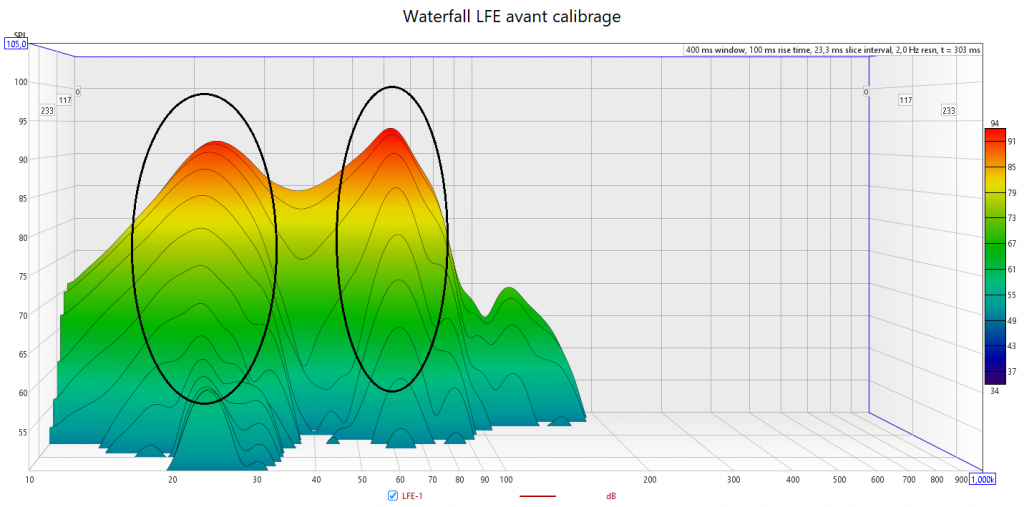 Le waterfall du LFE avant calibrage montre les fréquences dominantes à l’écoute qui déséquilibre le rendu du grave.