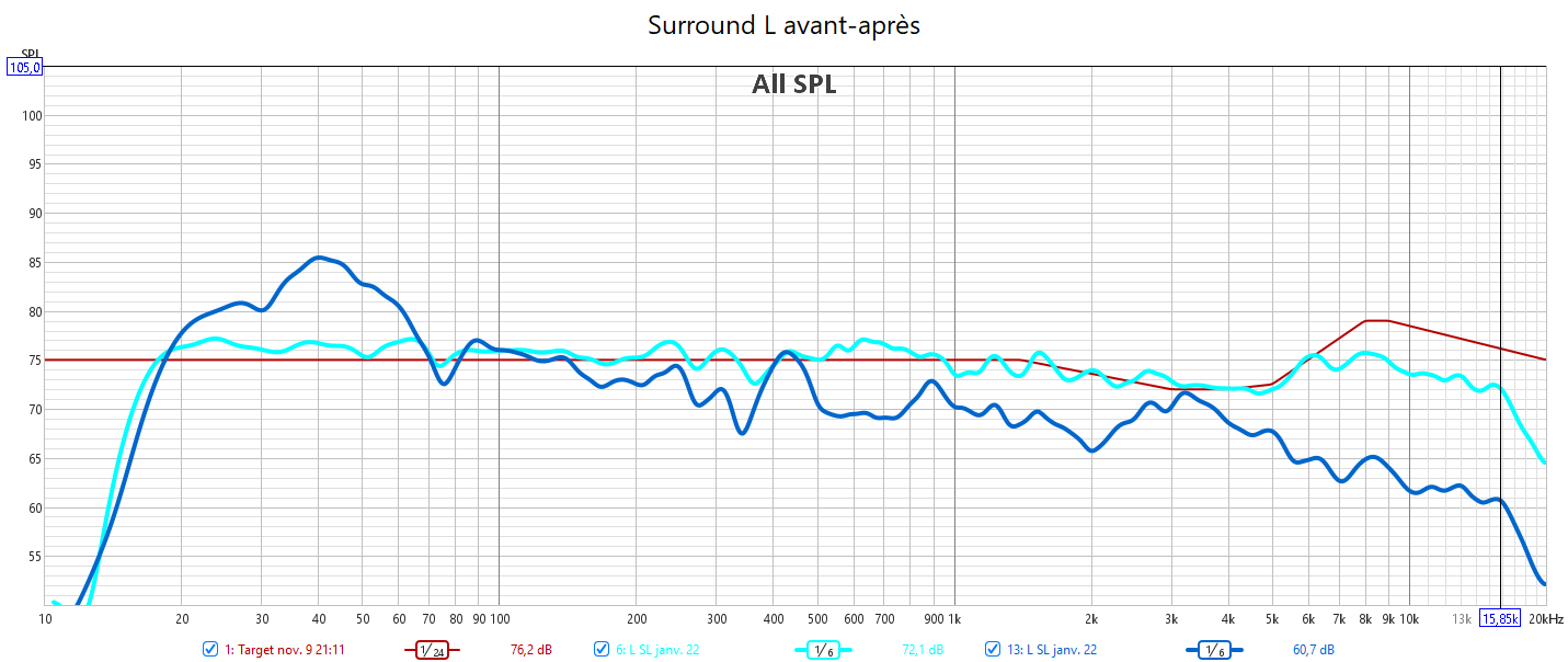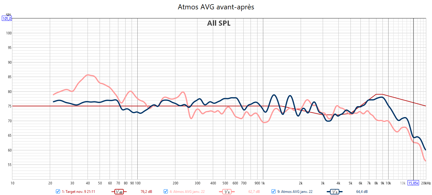 Après calibrage, j’obtiens des réponses bien plus linéaires et équilibrées, qui suivent la nouvelle courbe cible prenant en compte la sensibilité de l’oreille selon une extrapolation des courbes isosoniques. La scène frontale m’aura demandé un peu de travail, car la proximité des enceintes avec la toile n’est pas l’idéal pour l’aigu créant une réponse en peigne. C’est aussi le cas pour les atmos (derrière le revêtement des dalles du faux plafond). La réponse du LFE est bien meilleure et plus linéaire. Plus de pic à 40Hz. La réponse impulsionnelle est aussi améliorée. L’alignement des niveaux est bon assurant l’équilibre de la bulle sonore.