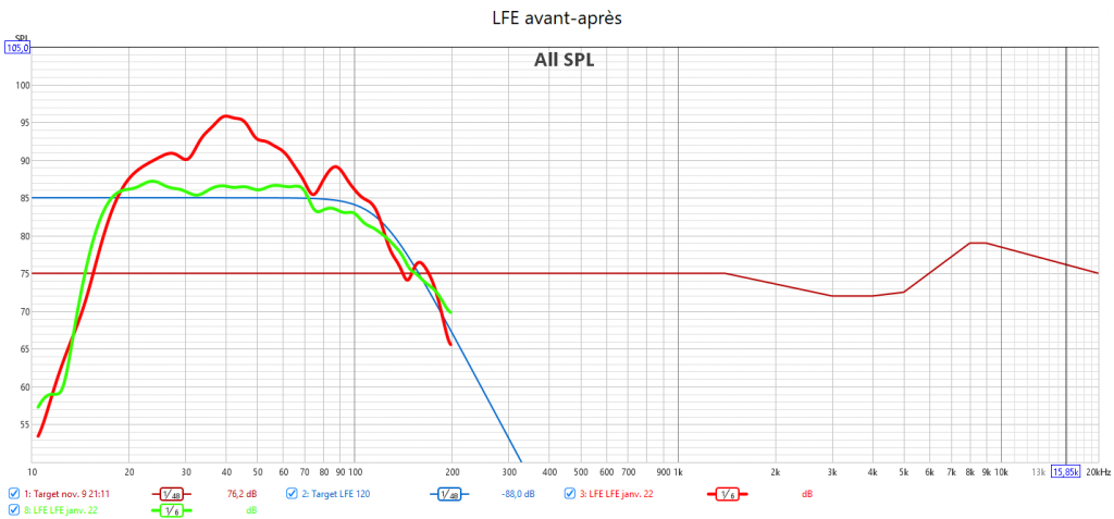 Après calibrage, toute le enceintes sont en « petite ». J’ai pu récupérer le retard du LFE et obtenir une bonne phase avec les enceintes.