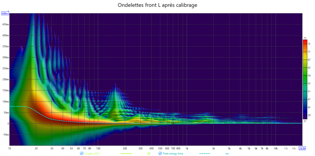 Ci-dessous la correction en amplitude avec Audyssey des frontales droite et gauche, la centrale, la surround gauche, l’atmos avant gauche et le LFE. Mais en tout premier, ce sont les spectrogrammes (ondelettes) des frontales gauche et droite montrant entre autres le bon alignement entre caissons et enceintes.