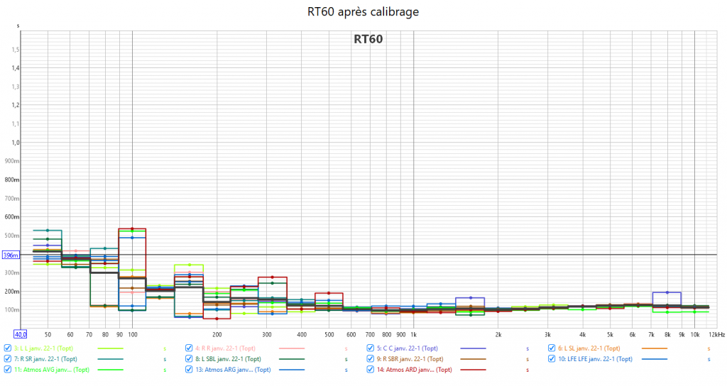 Pour l’acoustique et le temps de réverbération, on est très bon avec un RT60 en grande partie à 100 millisecondes. On remonte un peu pour rester sous les 200ms dans le haut grave. C’est bien. Une bonne acoustique nécessite plus de puissance pour les enceintes pour compenser l’absorption et encore plus dans l’aigu.