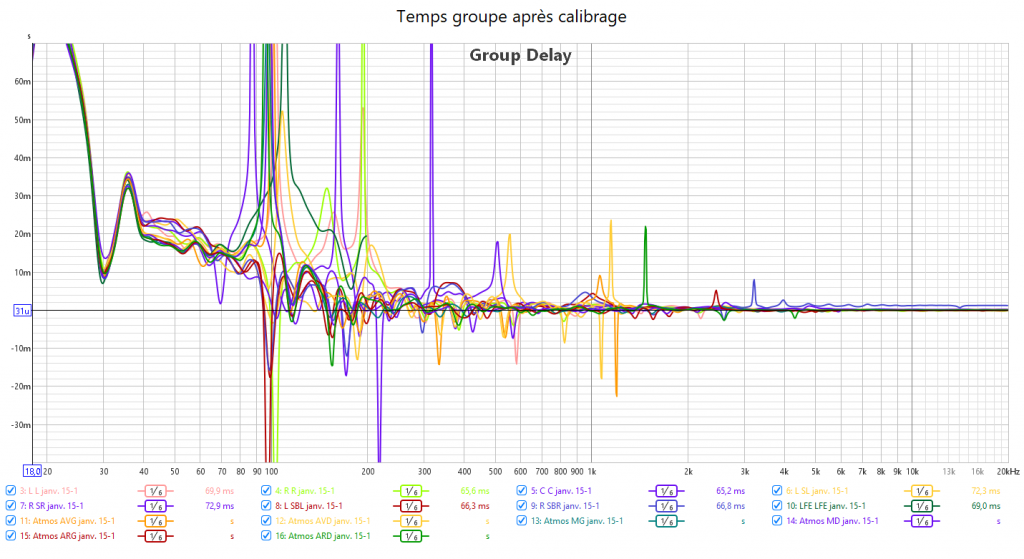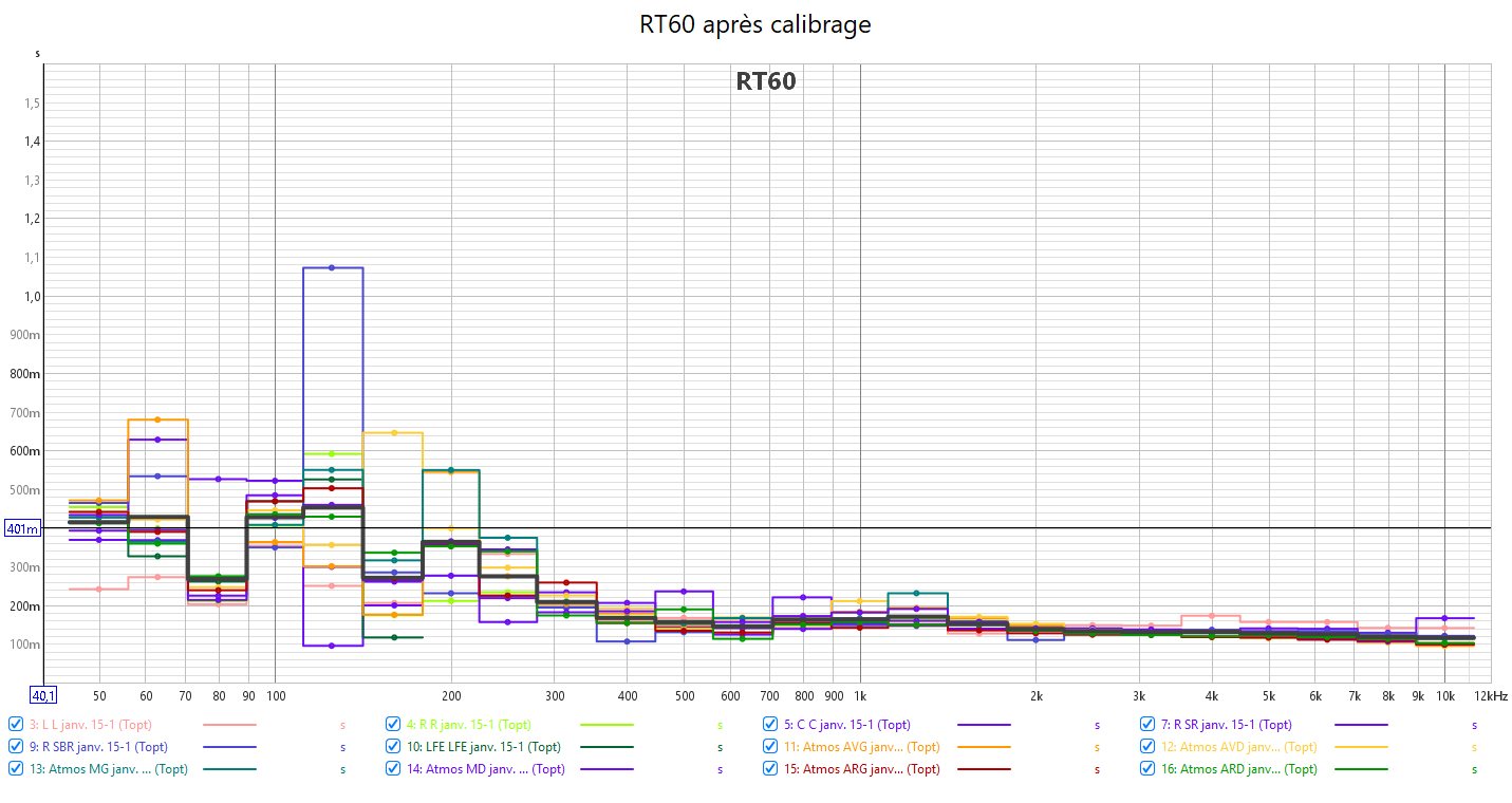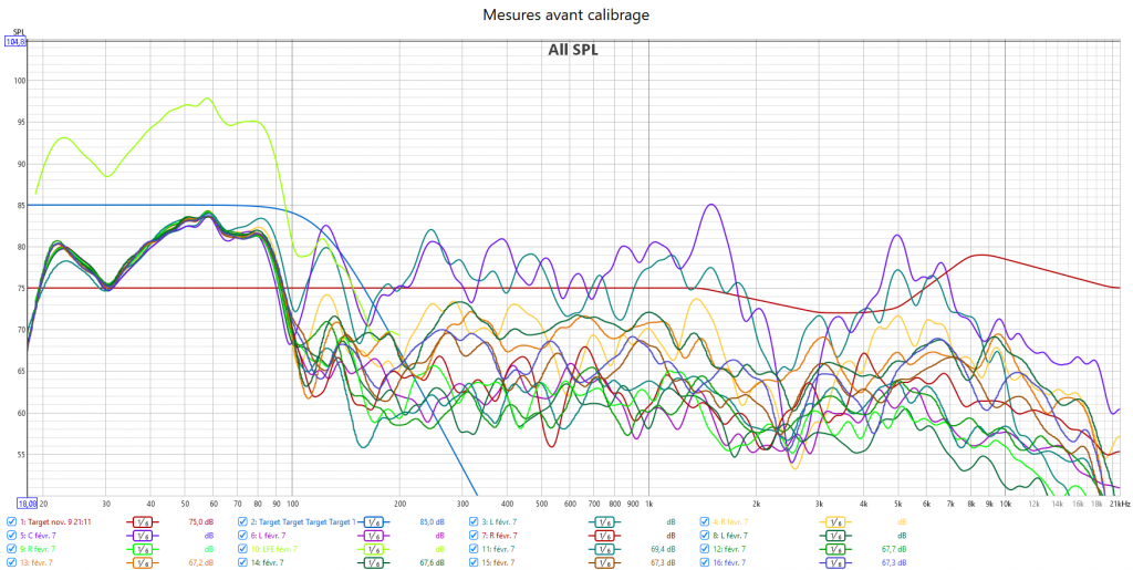Avant calibrage, ce qui saute aux yeux est la grosse différence de niveau entre les enceintes. Les écarts sont de plus de 10 dB. La scène frontale n’est pas équilibrée, la frontale droite étant moins forte. La bulle sonore est complètement déséquilibrée. Ce qui à l’écoute pré-calibrage s’était traduit par le manque d’effets surround et/ou atmos et donc un déséquilibre total de la bulle sonore. Les voix n’étaient pas naturelles. Les mesures montrent des défauts de réponse pour les LCR : trou dans l’aigu pour la centrale et la frontale droite et pas d’extrême aigu pour la frontale gauche. Le tweeter de la frontale gauche était débranché et les médiums de la centrale et la frontale droite sont défaillants. On constate dans l’ensemble la chute de la réponse des enceintes après 7 ou 8 kHz. Cela crée un manque de clarté et une perte de détails et spatialisation. La réponse dans le grave manque de linéarité et le niveau est un peu excessif pour conserver un bon équilibre tonal. L’alignement des JBL 4546C est perfectible surtout avec le 4648.