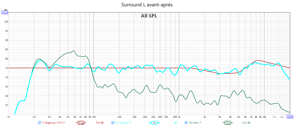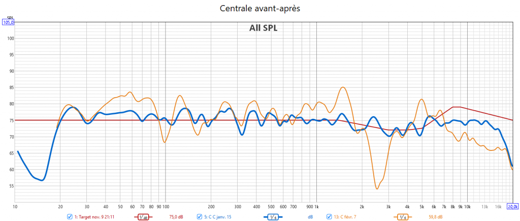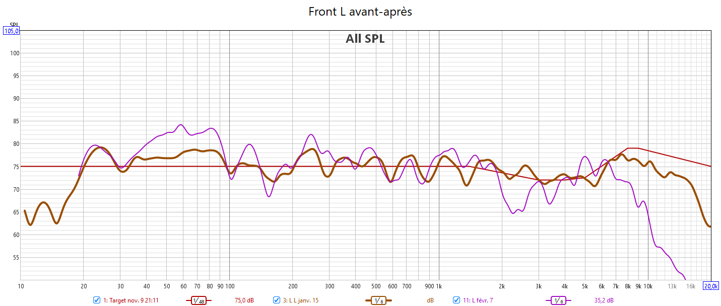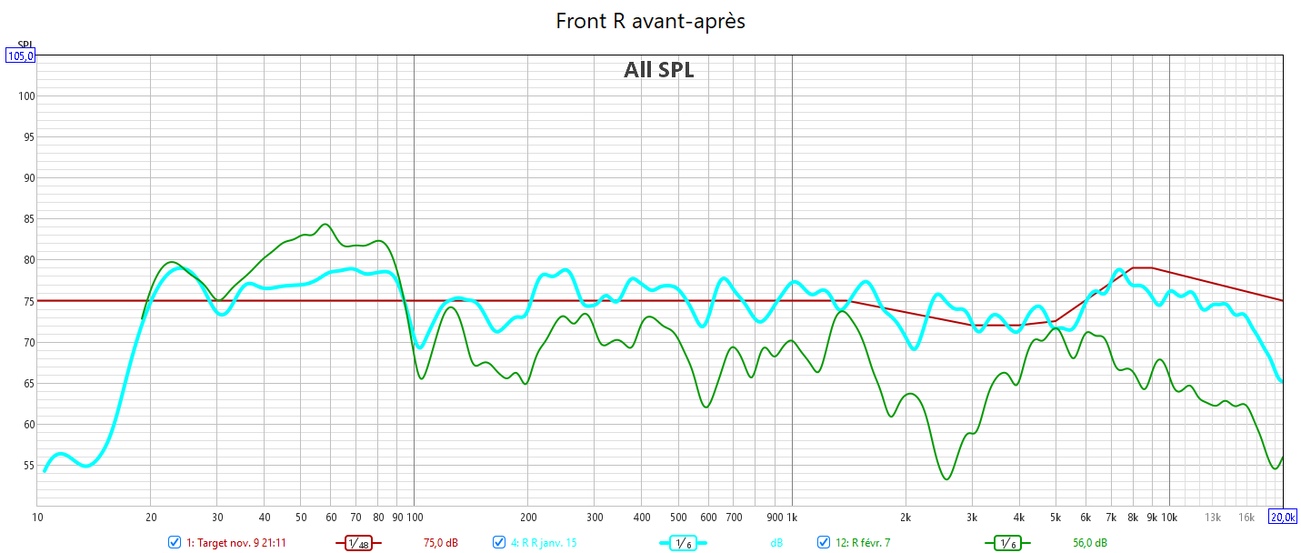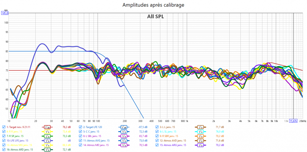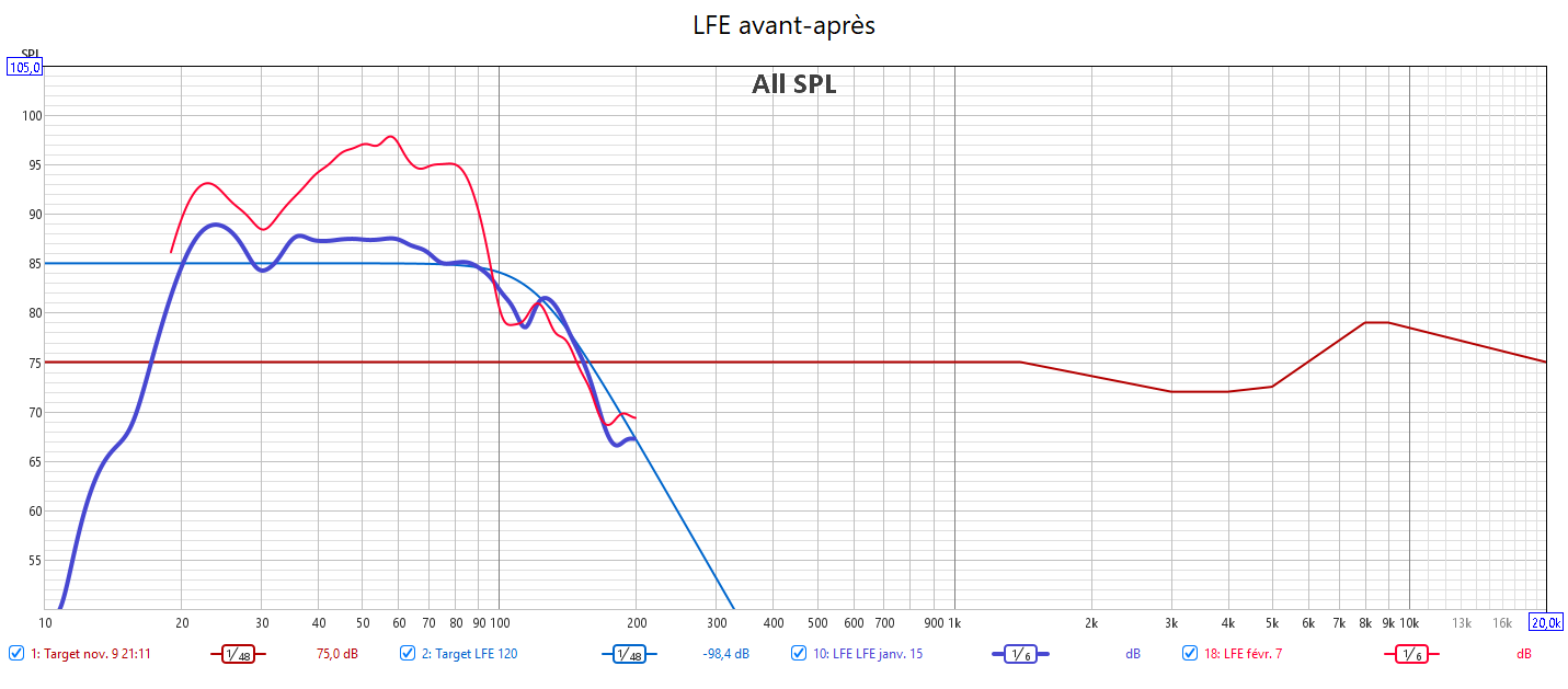 Après calibrage : j’ai effectué l’alignement des caissons avec les DSP des amplis PX10 en favorisant le temporel pour plus d’impact. Il n’y a pas photo concernant la réponse impulsionnelle si on la compare à un alignement en phase. L’objectif est atteint. 𝗟𝗲 𝗝𝗕𝗟 𝟰𝟲𝟰𝟴 𝗽𝗮𝗿𝘁𝗶𝗰𝗶𝗽𝗲 𝗽𝗹𝘂𝘀 𝗮̀ 𝗹’𝗮𝗺𝗲́𝗹𝗶𝗼𝗿𝗮𝘁𝗶𝗼𝗻 𝗱𝗲 𝗹𝗮 𝗿𝗲́𝗽𝗼𝗻𝘀𝗲 𝗶𝗺𝗽𝘂𝗹𝘀𝗶𝗼𝗻𝗻𝗲𝗹𝗹𝗲 𝗾𝘂’𝗮̀ 𝗹’𝗲́𝗹𝗲́𝘃𝗮𝘁𝗶𝗼𝗻 𝗱𝘂 𝗻𝗶𝘃𝗲𝗮𝘂 𝘀𝗼𝗻𝗼𝗿𝗲 𝗱𝘂 𝗟𝗙𝗘. La scène frontale est maintenant corrigée correctement en suivant la nouvelle courbe cible qui prend en compte la sensibilité de l’oreille. Les autres canaux suivent également la courbe cible pour assurer l’équilibre de la bulle sonore. J’ai soigné les crossover et la mise en phase avec le LFE. L’alignement temporel (réglages des distances) tient dans une fourchette inférieure à 0,5 ms comme j’ai l’habitude de la faire.