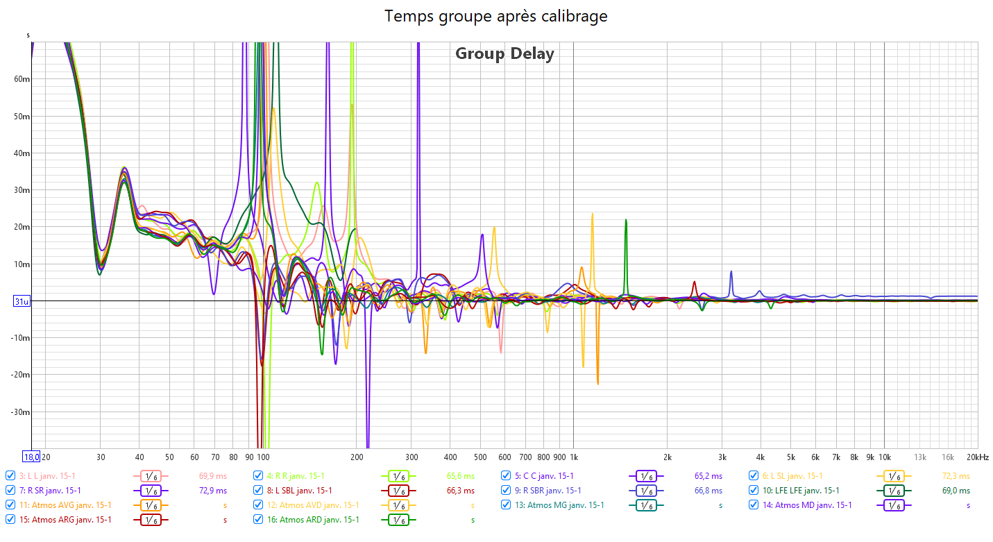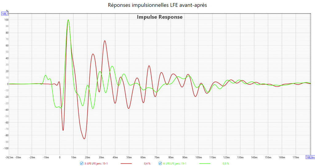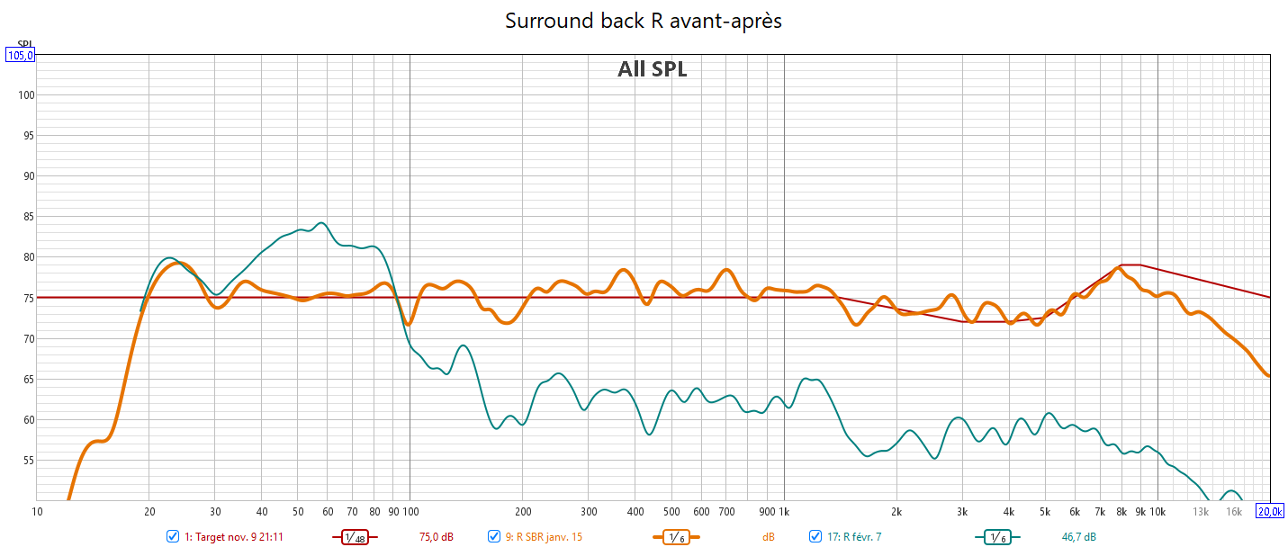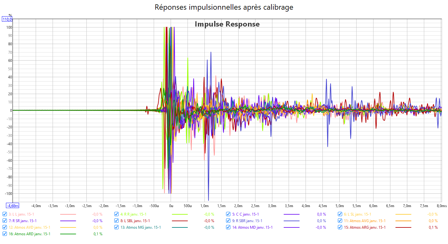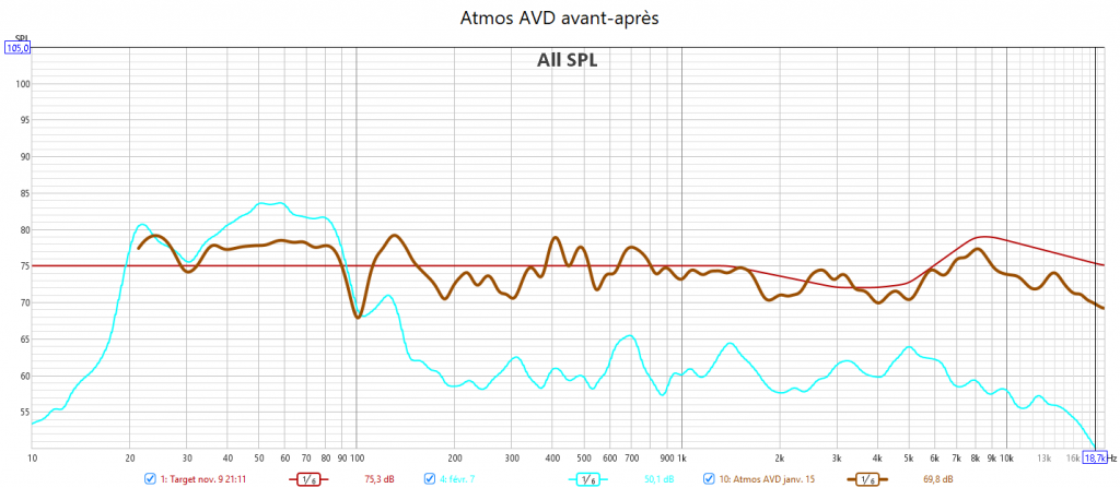 Après calibrage : j’ai effectué l’alignement des caissons avec les DSP des amplis PX10 en favorisant le temporel pour plus d’impact. Il n’y a pas photo concernant la réponse impulsionnelle si on la compare à un alignement en phase. L’objectif est atteint. 𝗟𝗲 𝗝𝗕𝗟 𝟰𝟲𝟰𝟴 𝗽𝗮𝗿𝘁𝗶𝗰𝗶𝗽𝗲 𝗽𝗹𝘂𝘀 𝗮̀ 𝗹’𝗮𝗺𝗲́𝗹𝗶𝗼𝗿𝗮𝘁𝗶𝗼𝗻 𝗱𝗲 𝗹𝗮 𝗿𝗲́𝗽𝗼𝗻𝘀𝗲 𝗶𝗺𝗽𝘂𝗹𝘀𝗶𝗼𝗻𝗻𝗲𝗹𝗹𝗲 𝗾𝘂’𝗮̀ 𝗹’𝗲́𝗹𝗲́𝘃𝗮𝘁𝗶𝗼𝗻 𝗱𝘂 𝗻𝗶𝘃𝗲𝗮𝘂 𝘀𝗼𝗻𝗼𝗿𝗲 𝗱𝘂 𝗟𝗙𝗘. La scène frontale est maintenant corrigée correctement en suivant la nouvelle courbe cible qui prend en compte la sensibilité de l’oreille. Les autres canaux suivent également la courbe cible pour assurer l’équilibre de la bulle sonore. J’ai soigné les crossover et la mise en phase avec le LFE. L’alignement temporel (réglages des distances) tient dans une fourchette inférieure à 0,5 ms comme j’ai l’habitude de la faire.