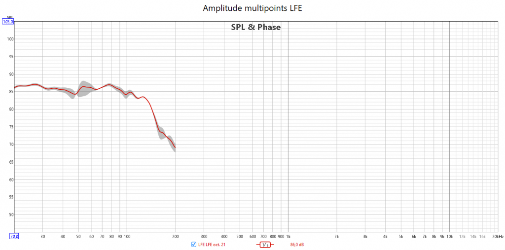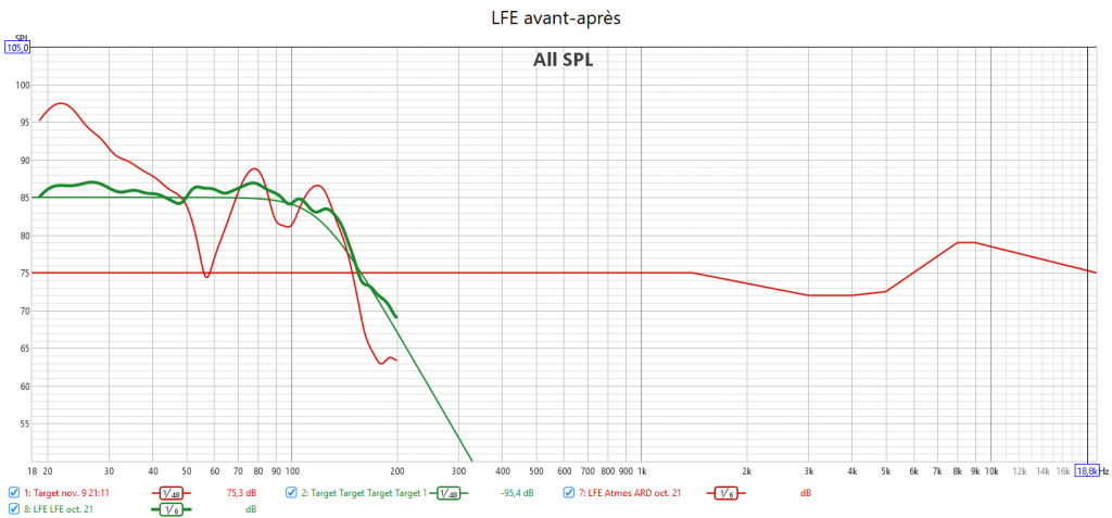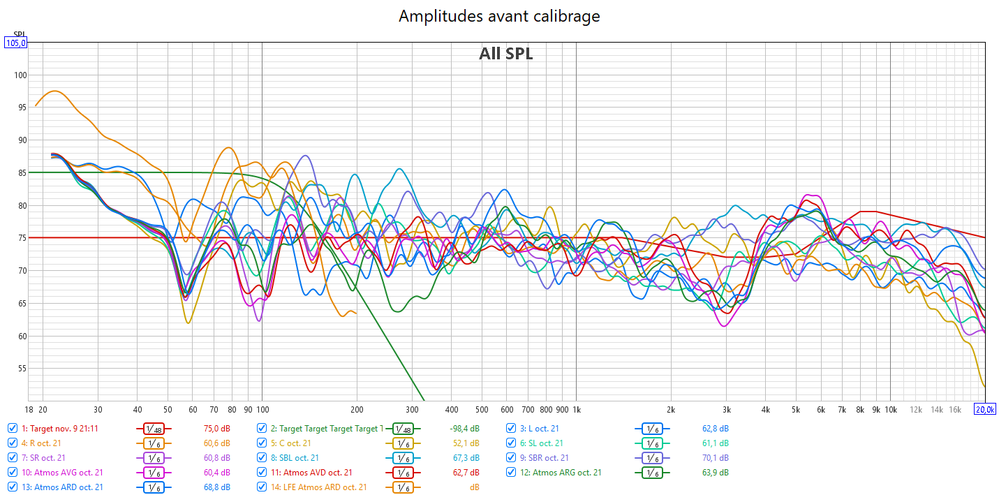 Avant calibrage, nous partons donc d’un ampli sans aucun calibrage. On ne peut que constater le déséquilibre tant en niveau qu’en rendu sonore. La scène frontale est beaucoup moins claire que les surround arrière ou les atmos (chute de la réponse dans les aigus). Cependant, la clarté est meilleure que si le calibrage Audyssey avait été effectué. Audyssey fait chuter la clarté du rendu final à cause de sa courbe cible utilisée par défaut. Les réponses mesurées manquent de linéarité et on est pour l’instant loin de la courbe cible. La réponse du LFE montre un room gain dans l’infra (sous 30 Hz), mais on a un nœud acoustique à 57 Hz. Il faudra déplacer un caisson pour les rendre complémentaires et supprimer ce nœud acoustique.