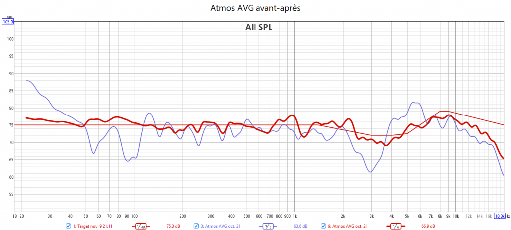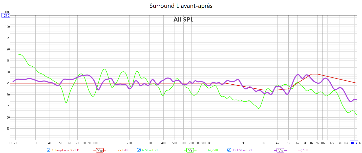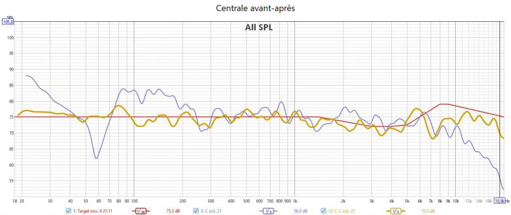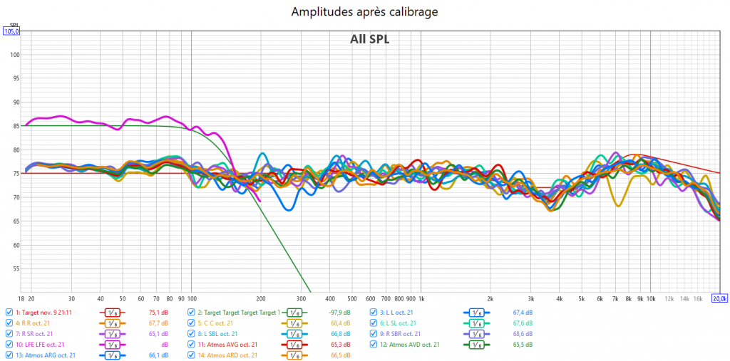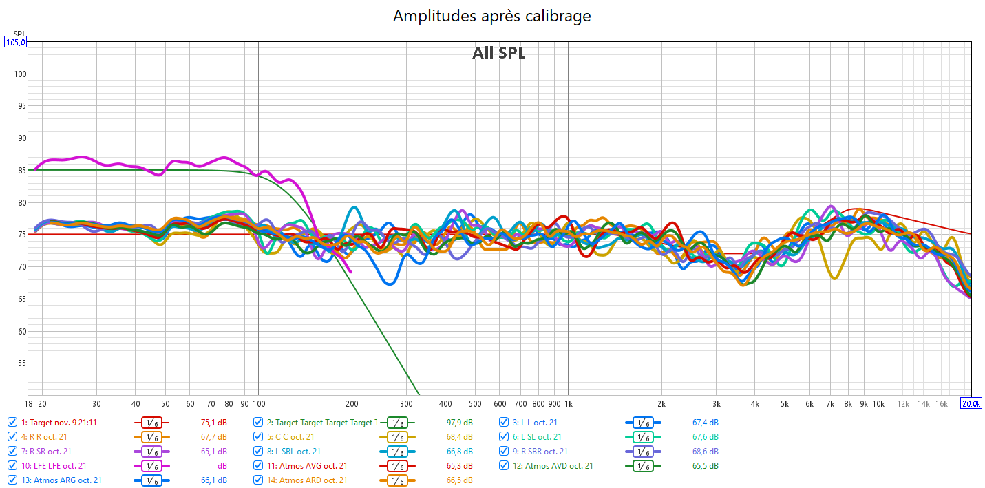 Après calibrage (mesures multipoints) : il a fallu déplacer le caisson avant droite à l’arrière droite. Audyssey a vraiment des difficultés à gérer le multi-caisson. Il m’a fallu modifier les distances pour aligner les réponses impulsionnelles et modifier les amplitudes avec les filtres SVS. Je suis quand même parvenu à obtenir un bon résultat pour le LFE. La réponse impulsionnelle est bien meilleure. Pour les autres canaux, la réponse en amplitude suit au mieux la nouvelle courbe cible qui prend en compte la sensibilité de l’oreille suivant une extrapolation des courbes isosoniques. Cela va assurer clarté, détail et précision sans agressivité. L’alignement des centrales n’a pas été simple non plus.