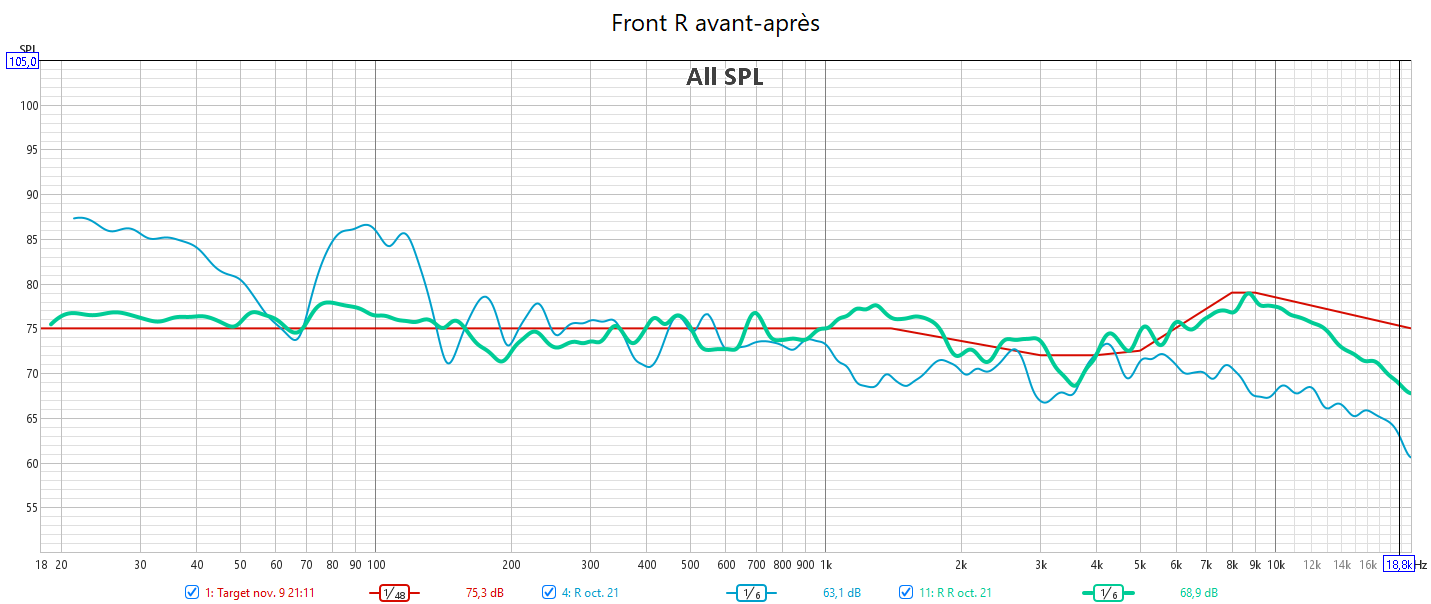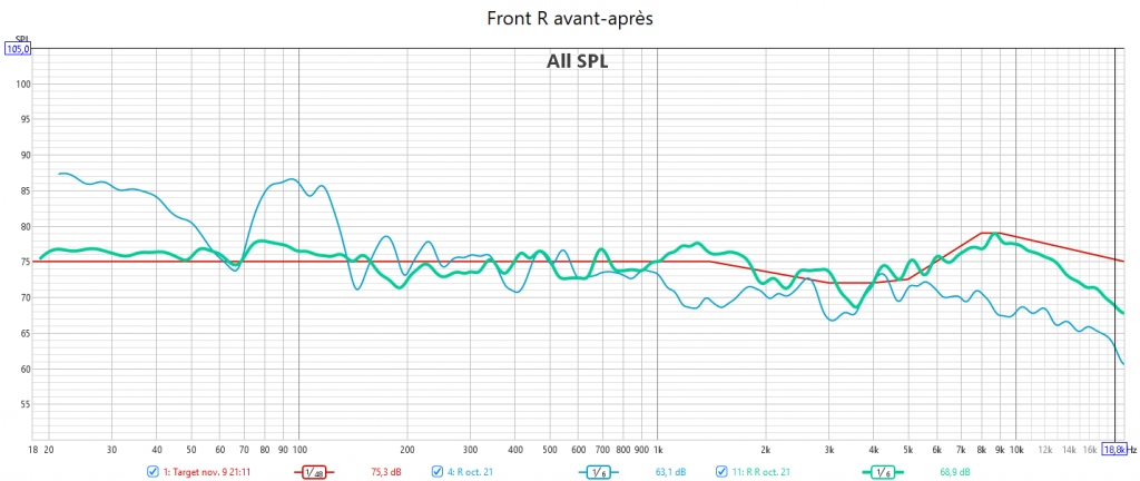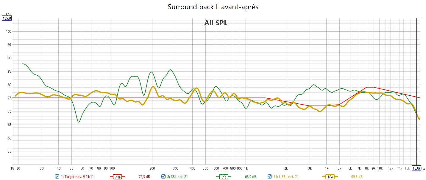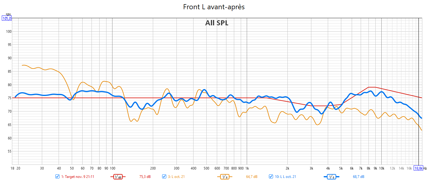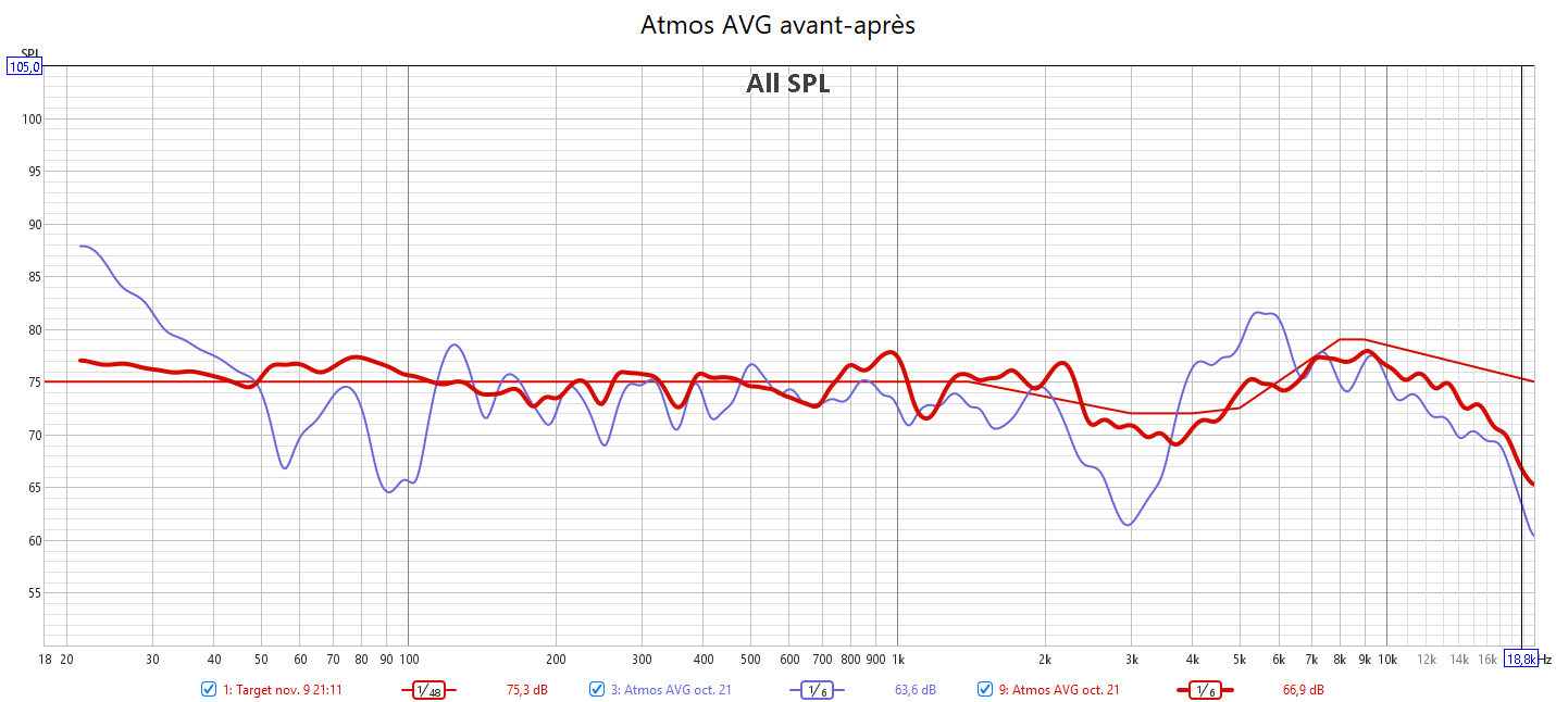 Après calibrage (mesures multipoints) : il a fallu déplacer le caisson avant droite à l’arrière droite. Audyssey a vraiment des difficultés à gérer le multi-caisson. Il m’a fallu modifier les distances pour aligner les réponses impulsionnelles et modifier les amplitudes avec les filtres SVS. Je suis quand même parvenu à obtenir un bon résultat pour le LFE. La réponse impulsionnelle est bien meilleure. Pour les autres canaux, la réponse en amplitude suit au mieux la nouvelle courbe cible qui prend en compte la sensibilité de l’oreille suivant une extrapolation des courbes isosoniques. Cela va assurer clarté, détail et précision sans agressivité. L’alignement des centrales n’a pas été simple non plus.