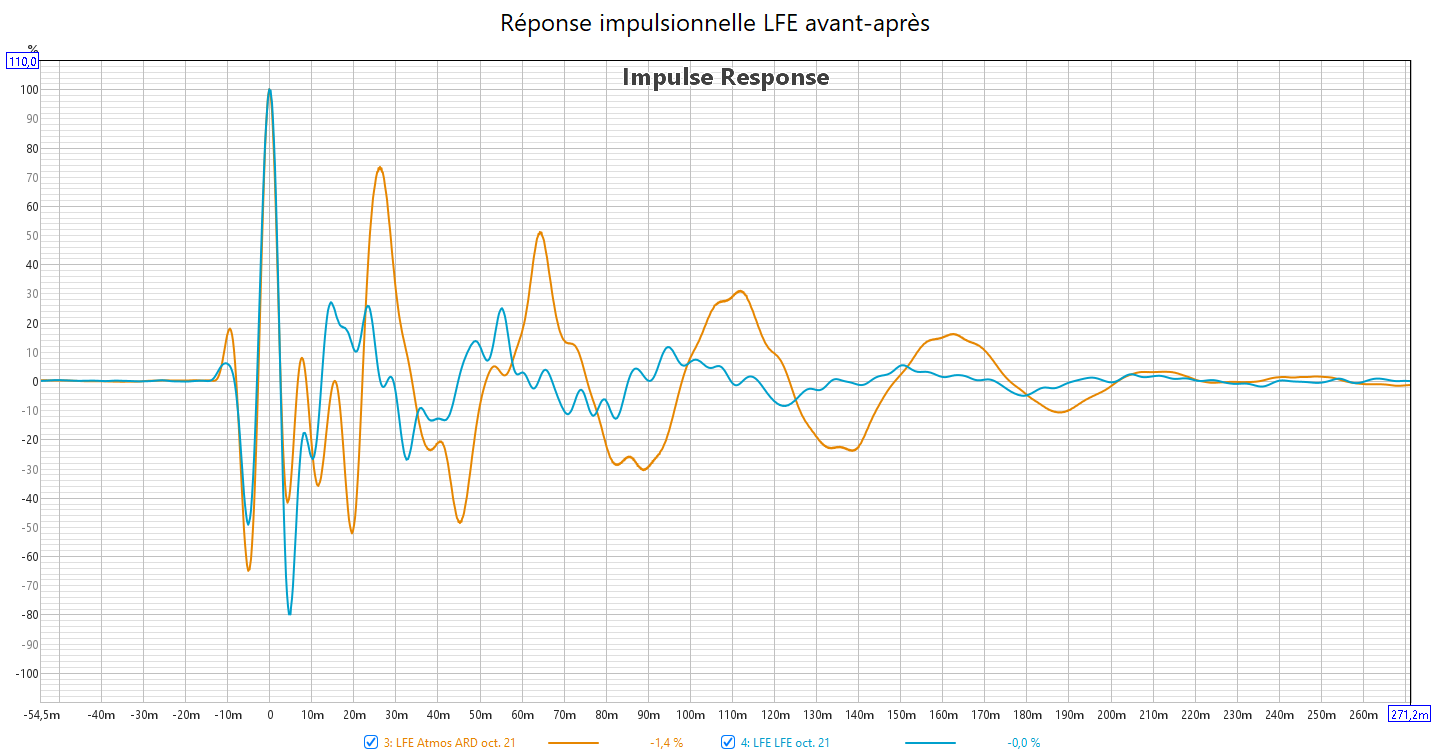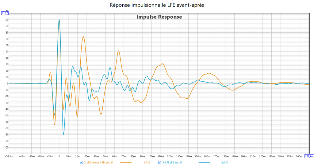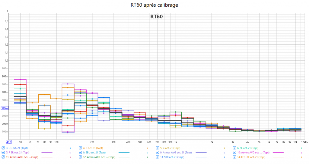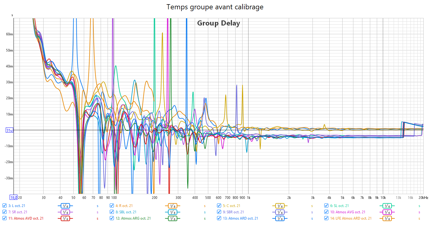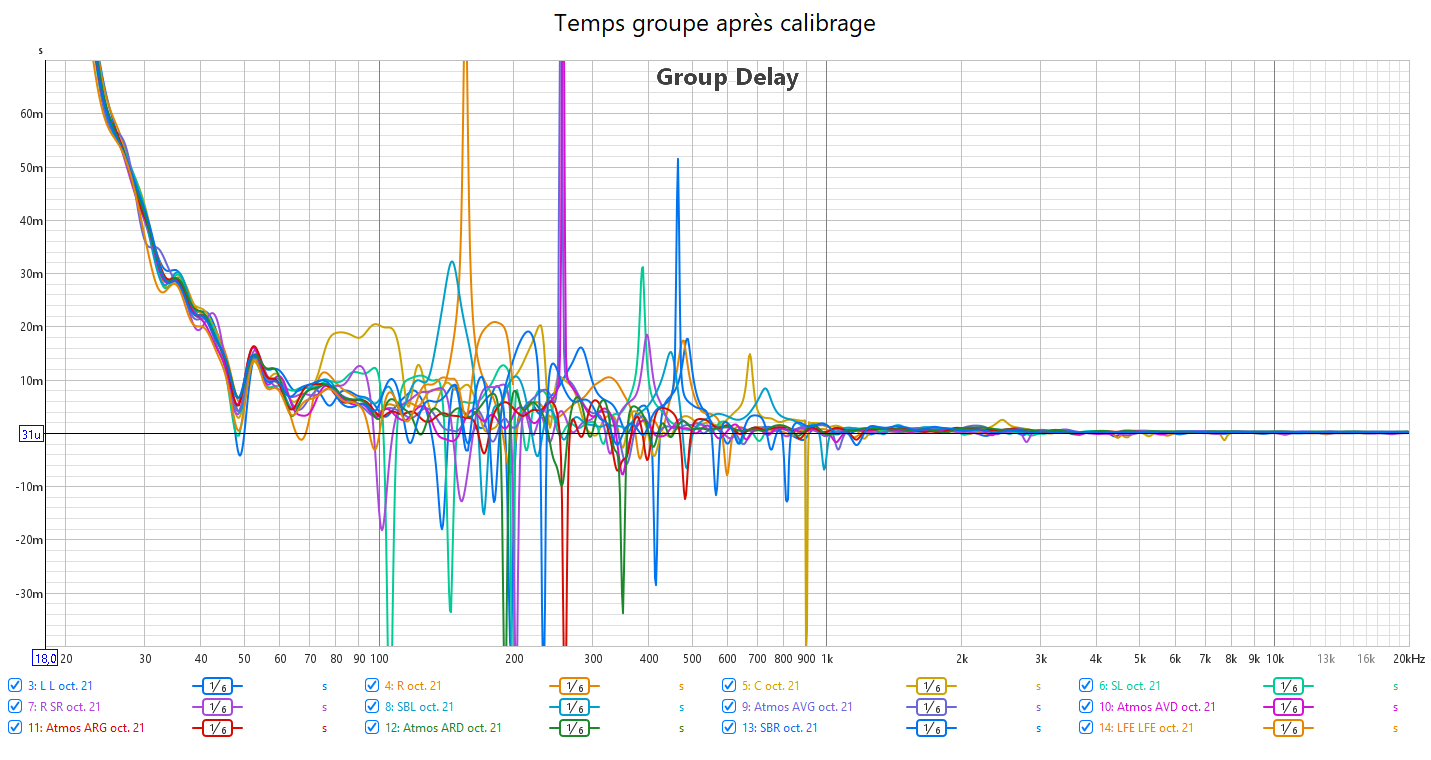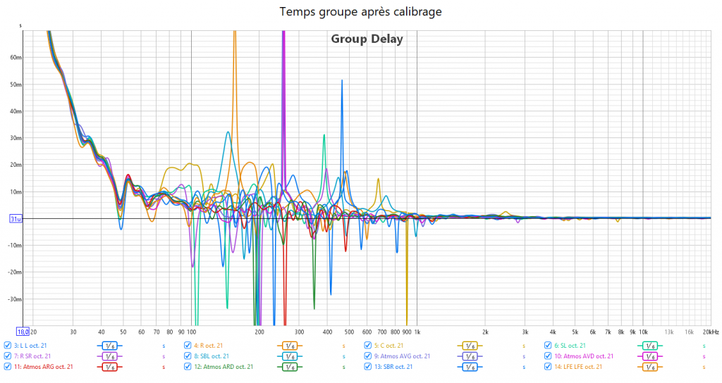 Après calibrage, un meilleur bass management permet d’obtenir de bien meilleures mesures de temps de groupe. J’ai compensé au mieux le retard de groupe du LFE en augmentant sa distance tout en conservant une bonne phase aux crossover. Chose que ne sait pas faire Audyssey.
