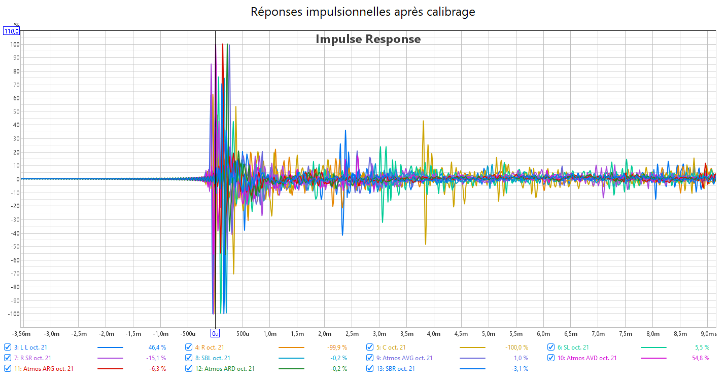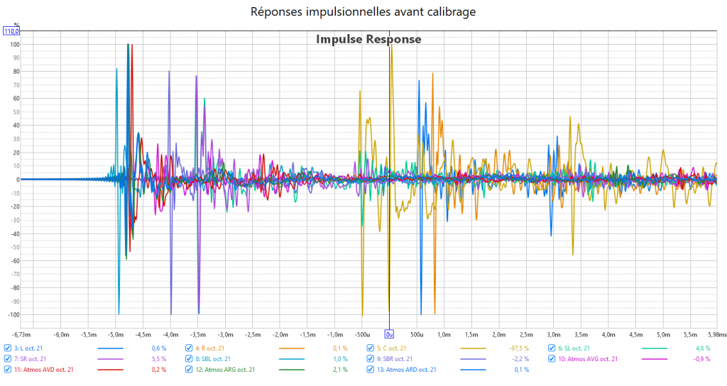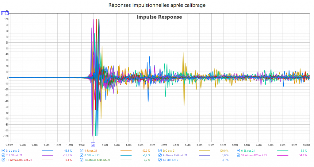 Ci-dessous la correction en amplitude avec Audyssey de la frontale gauche et droite, la centrale avec sa mesure multipoint, la surround gauche, la surround arrière gauche, l’atmos avant gauche et le LFE. On peut voir la très bonne amélioration de la réponse impulsionnelle du LFE après calibrage. La mesure multipoints (2 micros espacés de 32 cm) ne montre pas de gros problème sur la zone d’écoute.