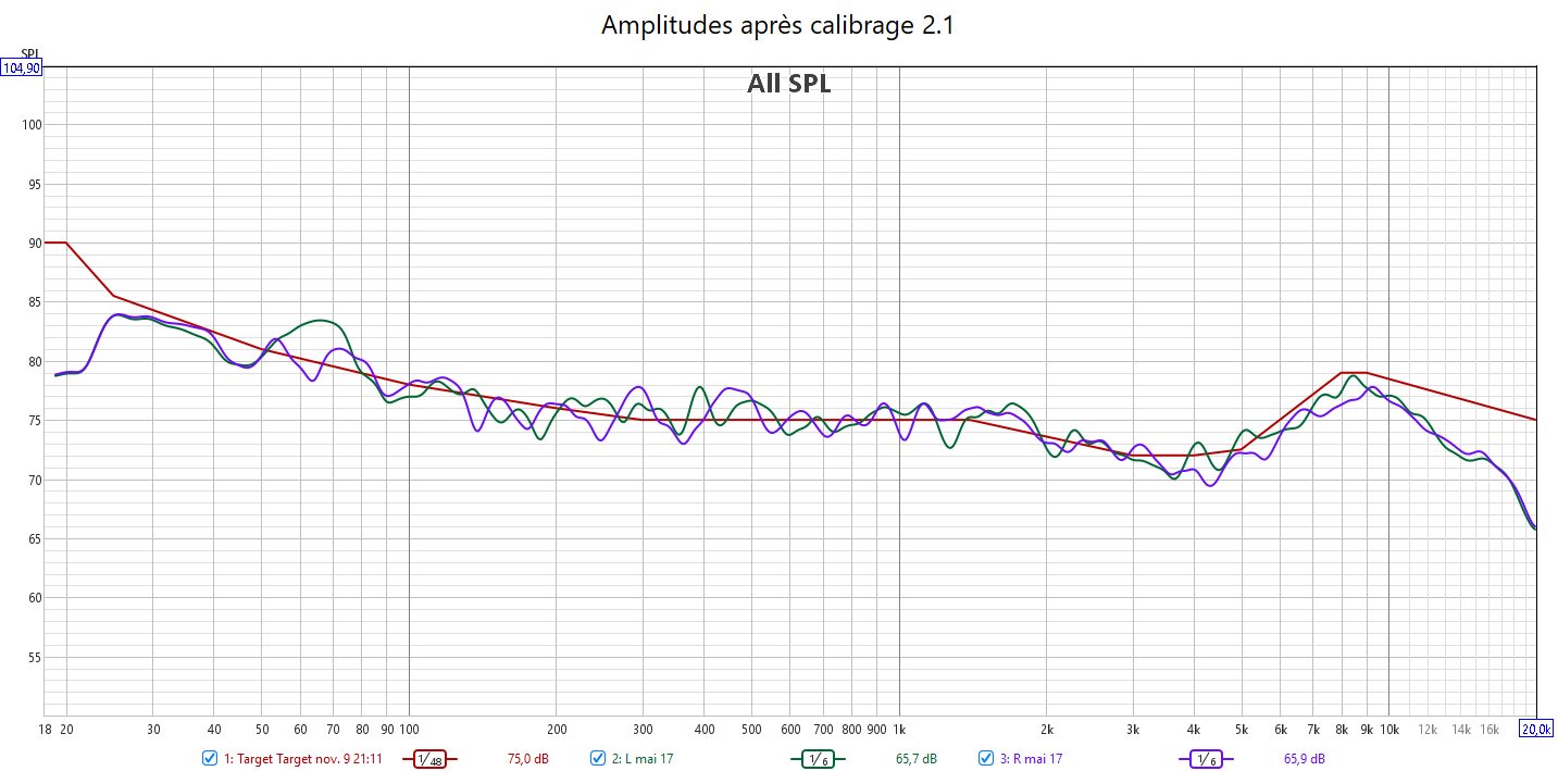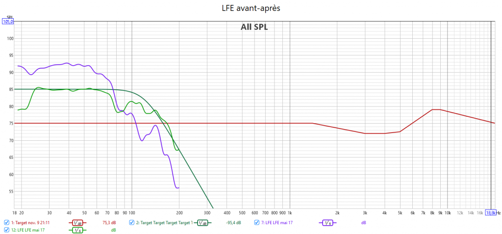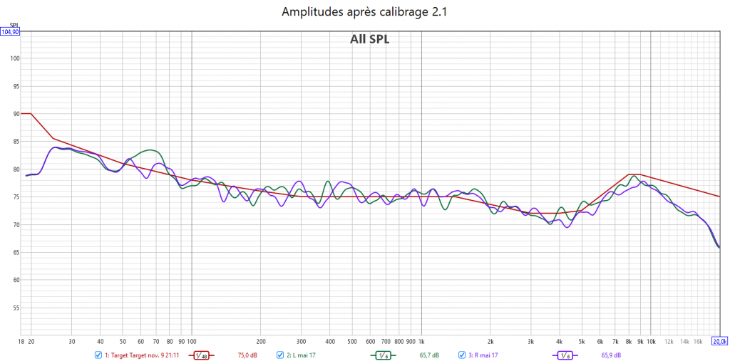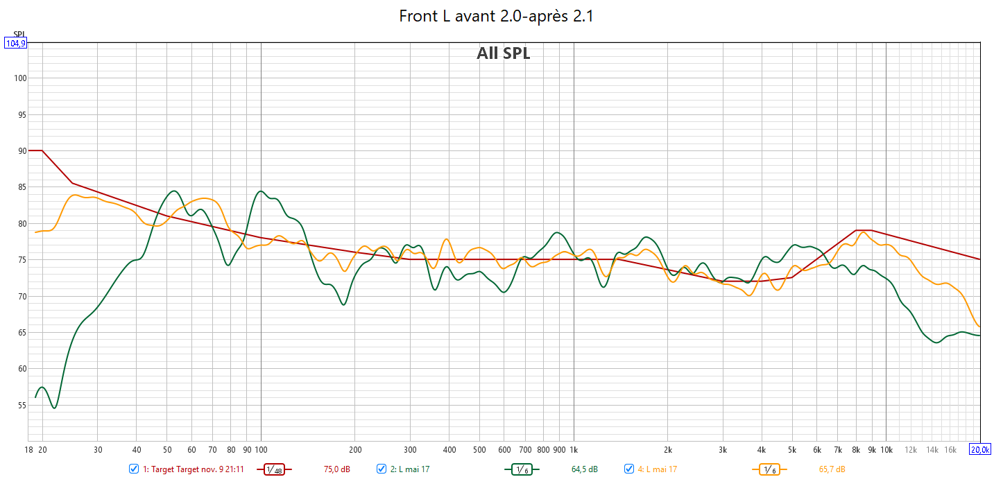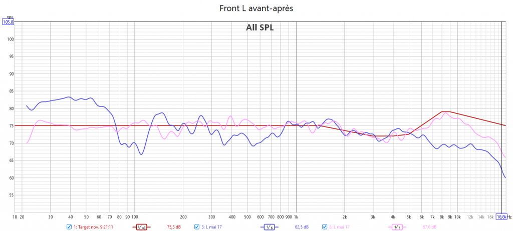 Ci-dessous la correction en amplitude avec Audyssey des 2 frontales associées au caisson.