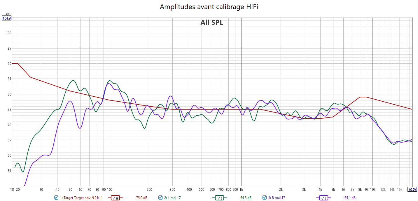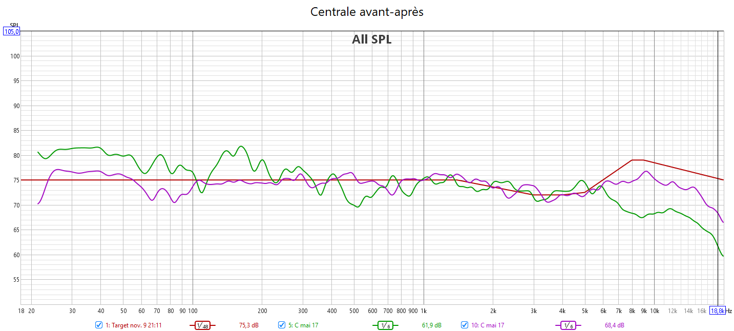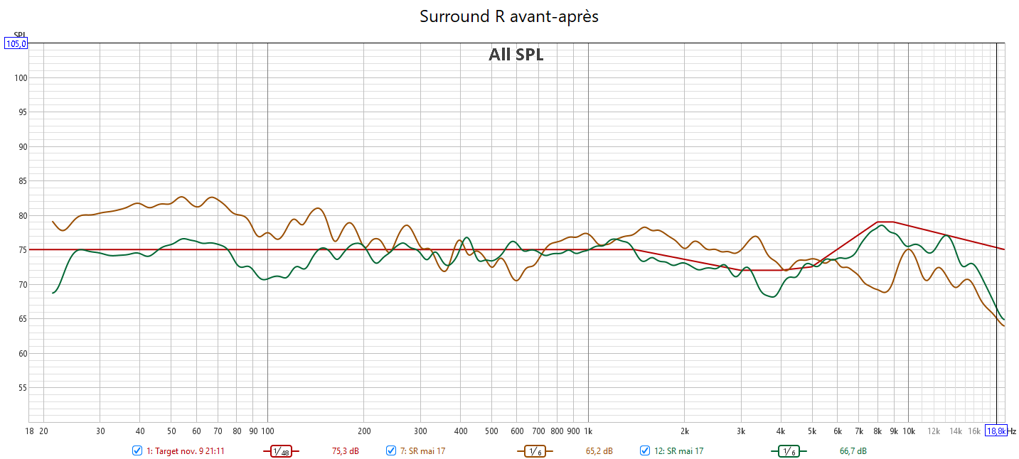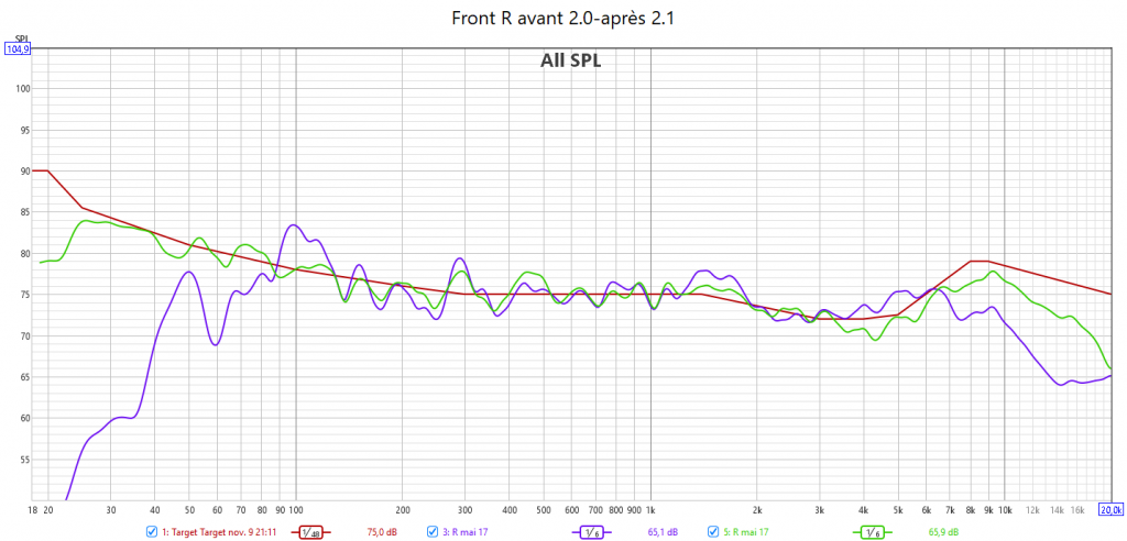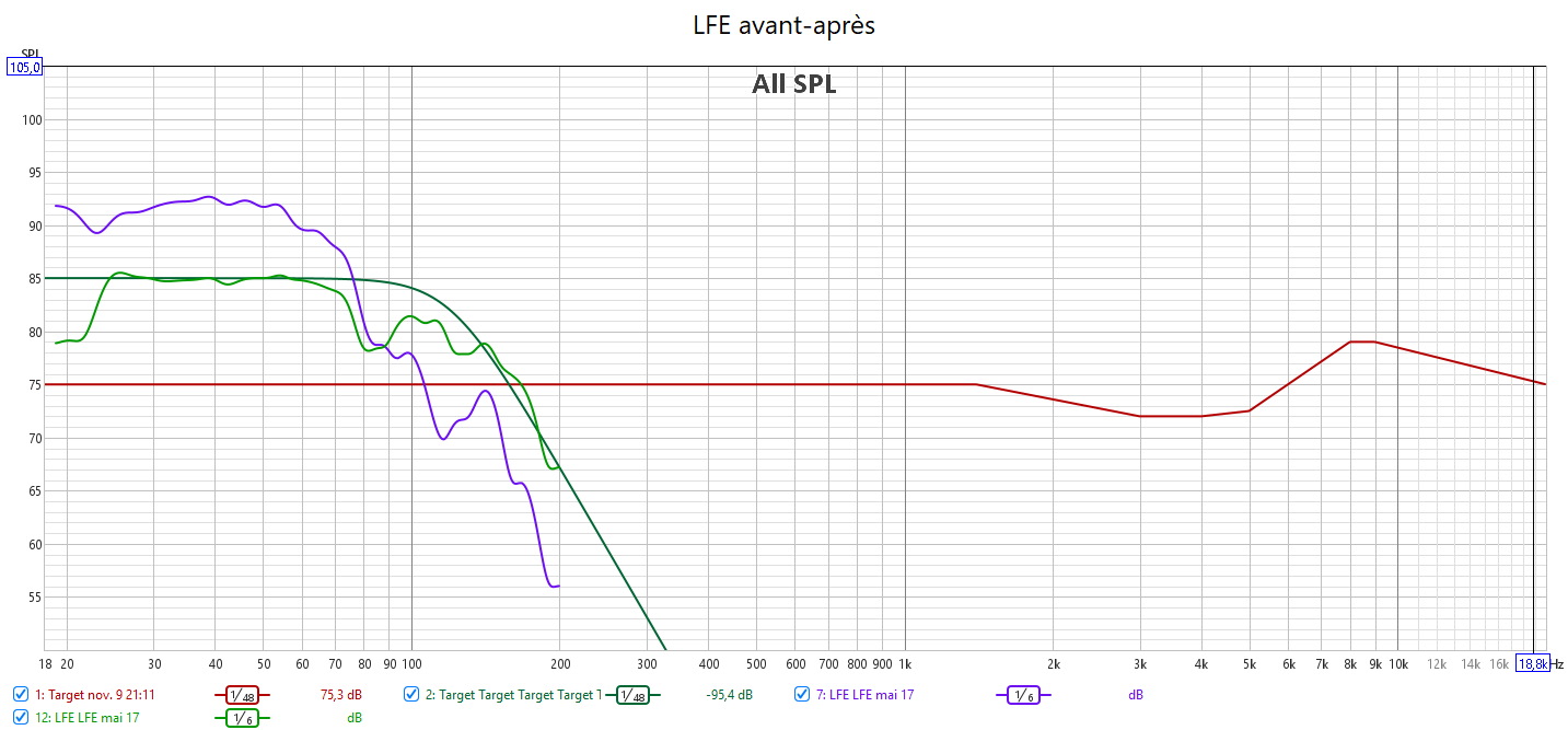 Ci-dessous la correction en amplitude avec Audyssey des 2 frontales associées au caisson.