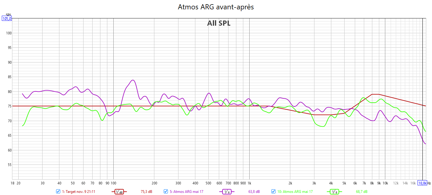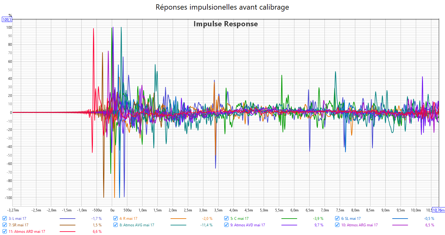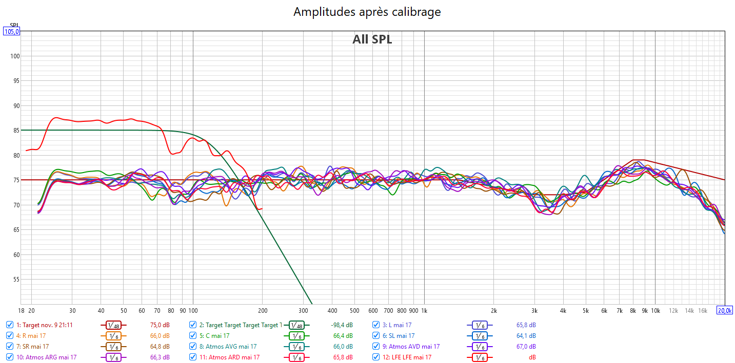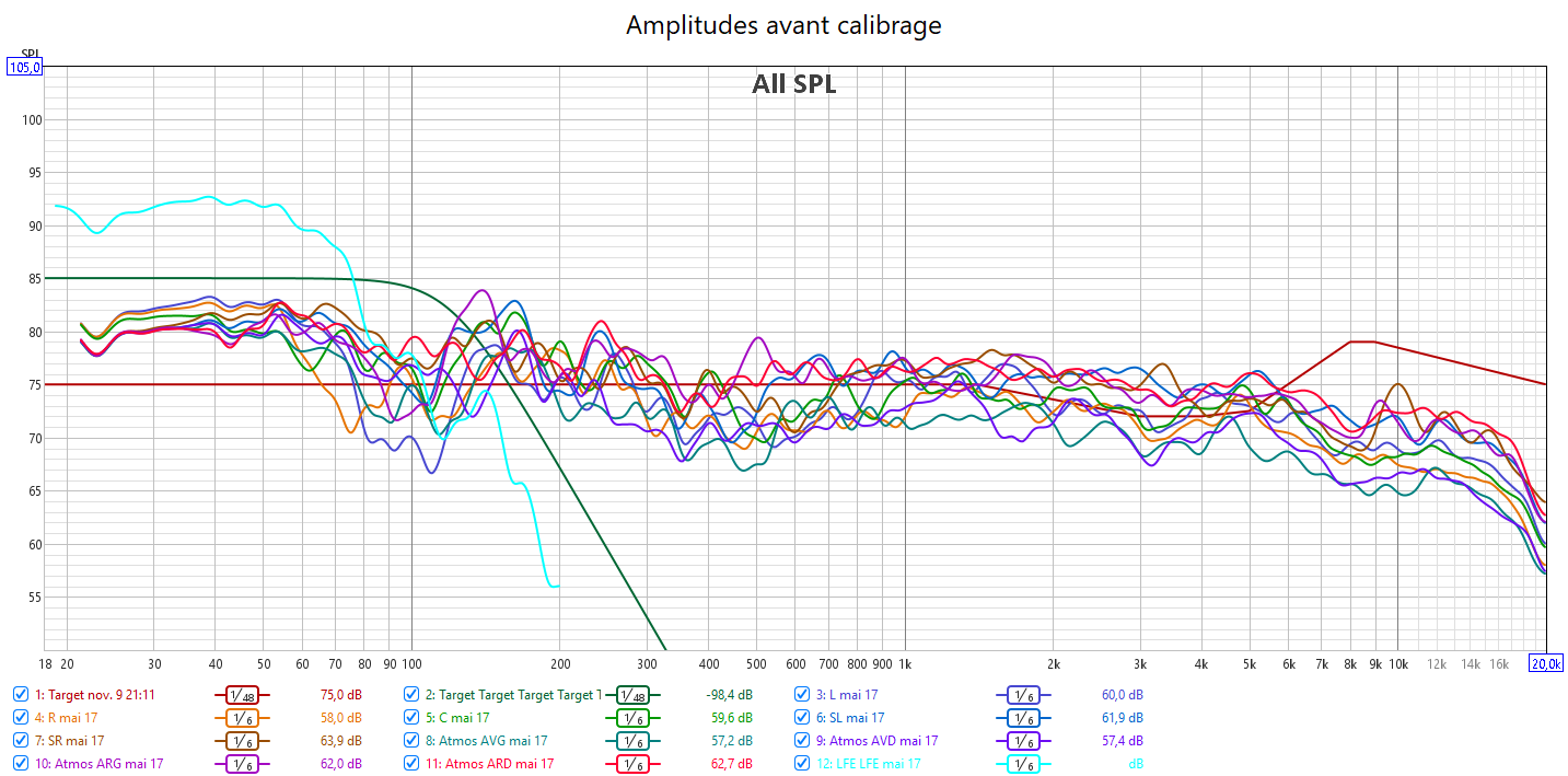 Ci-dessous la correction en amplitude avec Audyssey de la frontale gauche, la centrale, la surround droite, les atmos avant droite et arriè gauche, et le LFE.