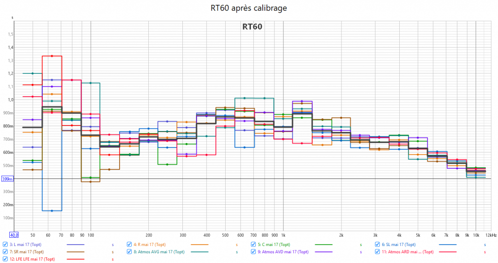 L’acoustique en pièce de vie est bien souvent le point faible. Le temps de réverbération (RT60) est ici un peu élevé avec environ 800 ms. Ce qui est aussi moins bon, c’est que le RT60 oscille en fonction des fréquences. Il ne faudrait pas dépasser environ 400 ms pour ce volume de pièce et on chercherait même à descendre en-dessous pour le home cinéma.