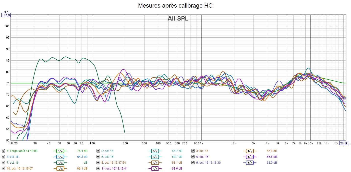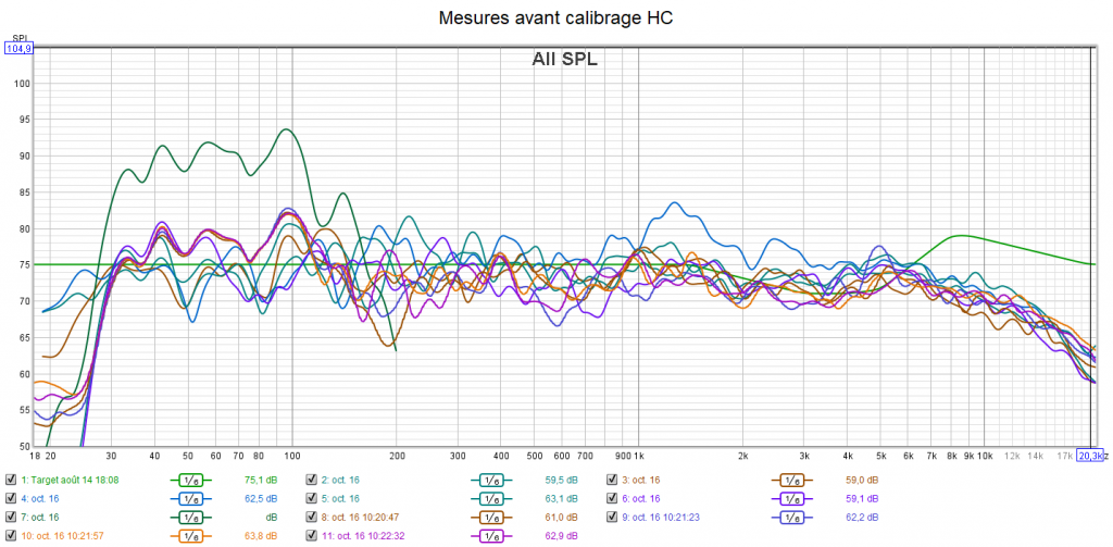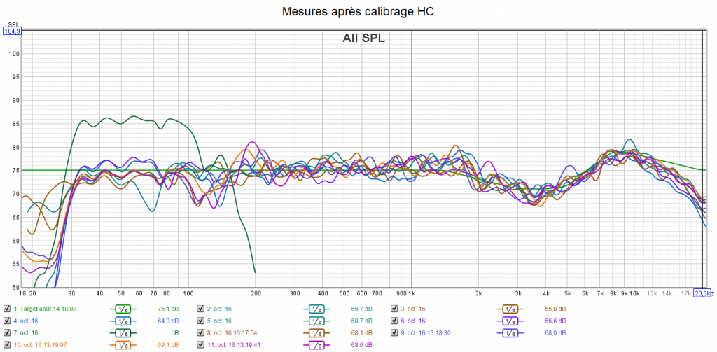 Avant calibrage, lors de l’écoute, je constate que la centrale est en « grande ». Je voyais bouger les membranes. Il n’y a pas de plus value à cela. Et c’est même une consommation inutile d’énergie sur l’ampli et de la distorsion supplémentaire pour les médiums. Les mesures montrent une harmonie des niveaux sonores qui est perfectible. Le niveau de la centrale est trop haut. La réponse des enceintes chute dans l’extrême aigu. Comme souvent, on a une bande passante qui s’arrête à environ 8 kHz (-3 dB). Donc ça bouche la clarté et les détails. Le grave ne descend pas très bas, mais c’est conforme aux caractéristiques du caisson. Son niveau est un peu haut. On peut noter que les 936 descendent plus bas que le caisson. Ce qui permettra de les utiliser en en « grande ». Le calibrage s’effectue suivant la nouvelle courbe cible qui remplace celle d’Audyssey pour prendre en compte la sensibilité de l’oreille suivant une extrapolation des courbes isosonique de Fletcher et Munson.