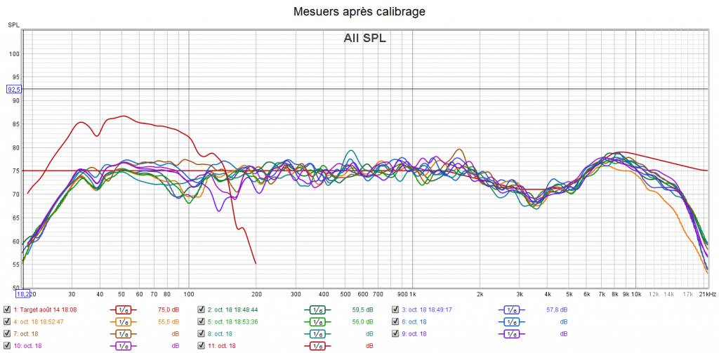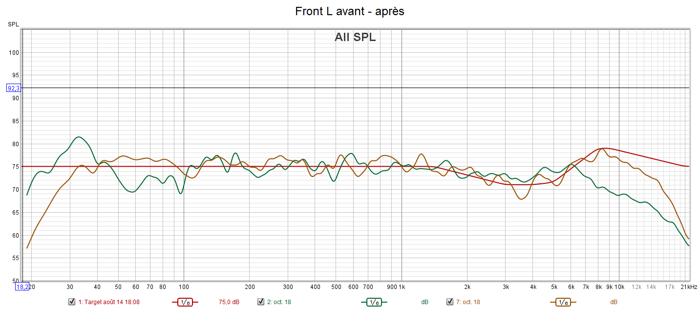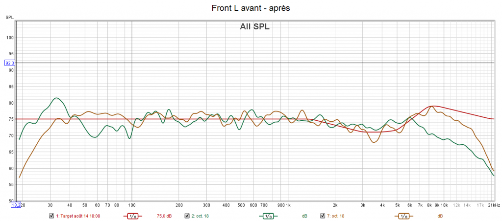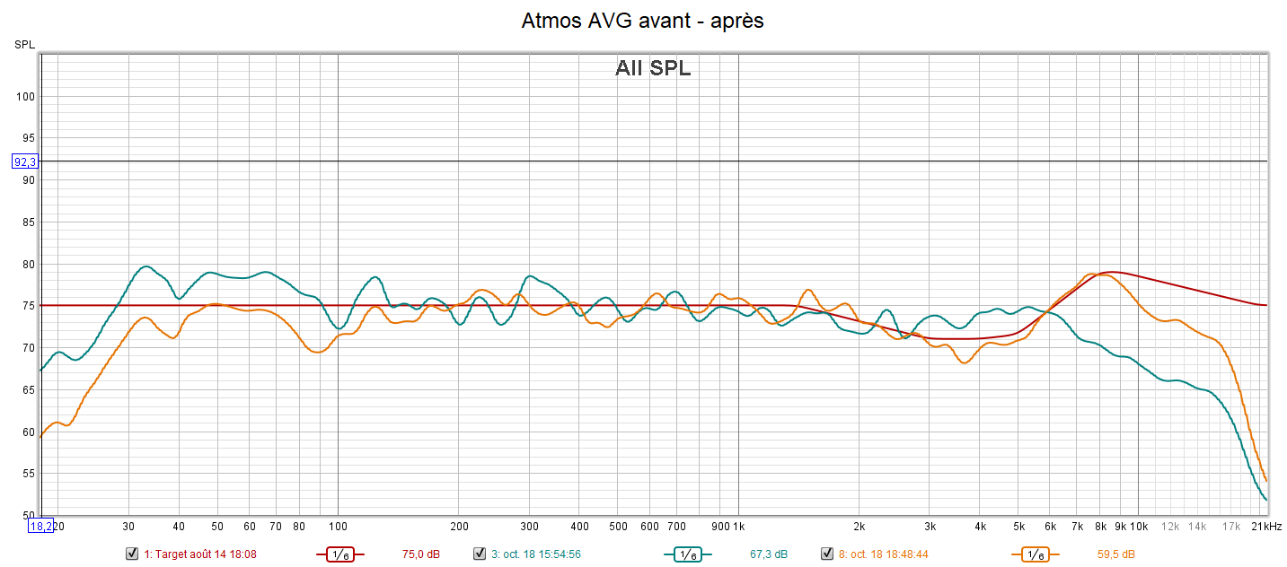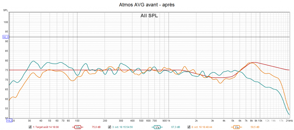 Après calibrage qui s’effectue suivant une nouvelle courbe cible extrapolée des courbes isosoniques de Flutcher et Munson pour prendre en compte la sensibilité de l’oreille, la position d’écoute est légèrement avancée pour être mieux positionné par rapport aux surrounds et aux atmos. Le grave gagne en bande passante avec une réponse plus linéaire. La phase du caisson est ajustée à celle des enceintes. On obtient une amélioration de la distorsion dans le grave. La réponse de chaque canal suit la nouvelle courbe cible pour un rendu plus clair, plus détaillé, plus précis, mieux spatialisé, plus intelligible comme pour la centrale, mais sans agressivité. Les problèmes d’intelligibilité ne sont pas des problèmes de puissances, mais de tonalité (équilibre entre graves, médiums et aigus). Les niveaux sont encore mieux ajustés qu’avant. La bulle sonore est optimisée.