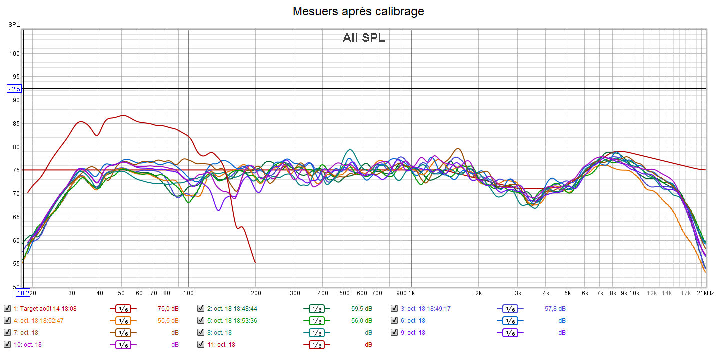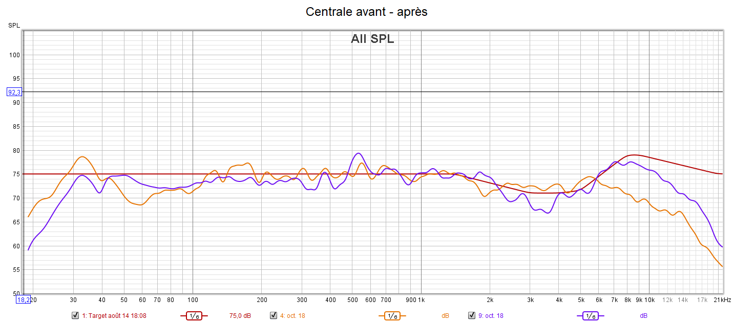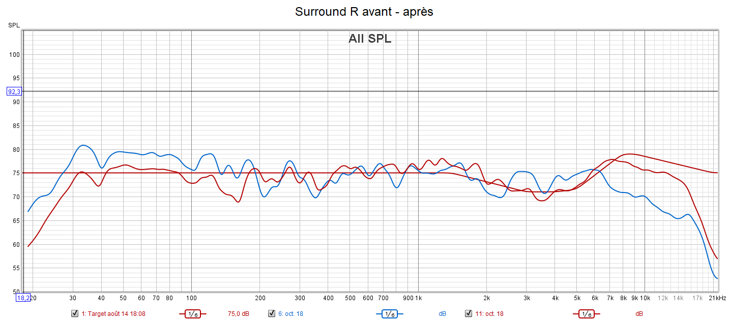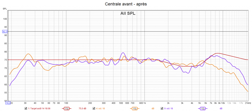 Après calibrage qui s’effectue suivant une nouvelle courbe cible extrapolée des courbes isosoniques de Flutcher et Munson pour prendre en compte la sensibilité de l’oreille, la position d’écoute est légèrement avancée pour être mieux positionné par rapport aux surrounds et aux atmos. Le grave gagne en bande passante avec une réponse plus linéaire. La phase du caisson est ajustée à celle des enceintes. On obtient une amélioration de la distorsion dans le grave. La réponse de chaque canal suit la nouvelle courbe cible pour un rendu plus clair, plus détaillé, plus précis, mieux spatialisé, plus intelligible comme pour la centrale, mais sans agressivité. Les problèmes d’intelligibilité ne sont pas des problèmes de puissances, mais de tonalité (équilibre entre graves, médiums et aigus). Les niveaux sont encore mieux ajustés qu’avant. La bulle sonore est optimisée.