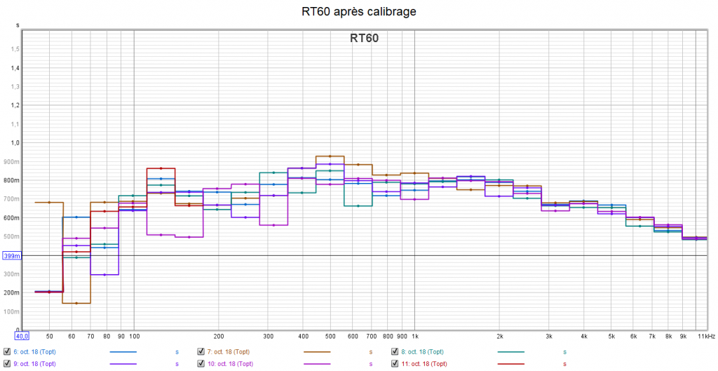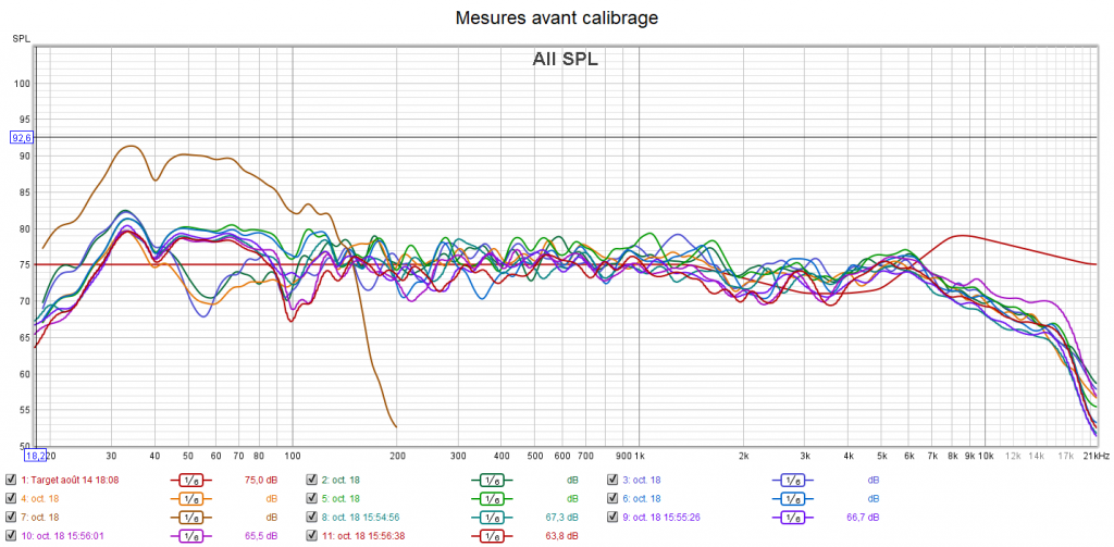 Avant calibrage, le niveau du LFE est peut-être un peu élevé, mais reste en cohérence avec le rendu. La bande passante du LFE s’arrête à 80 Hz. Elle est normée à 120 Hz. On observe des problèmes de phase avec des pertes de niveau sonore vers les 60 et 100 Hz. Le niveau sonore de chaque canal est plutôt bon. Cela harmonise la bulle sonore. Par contre la réponse de tous les canaux chute après 7 kHz. C’est un constat que je fais à quasi chaque calibrage : perte de clarté, de détails, de précision et de spatialisation. Il faut modifier la courbe cible du calibrage.