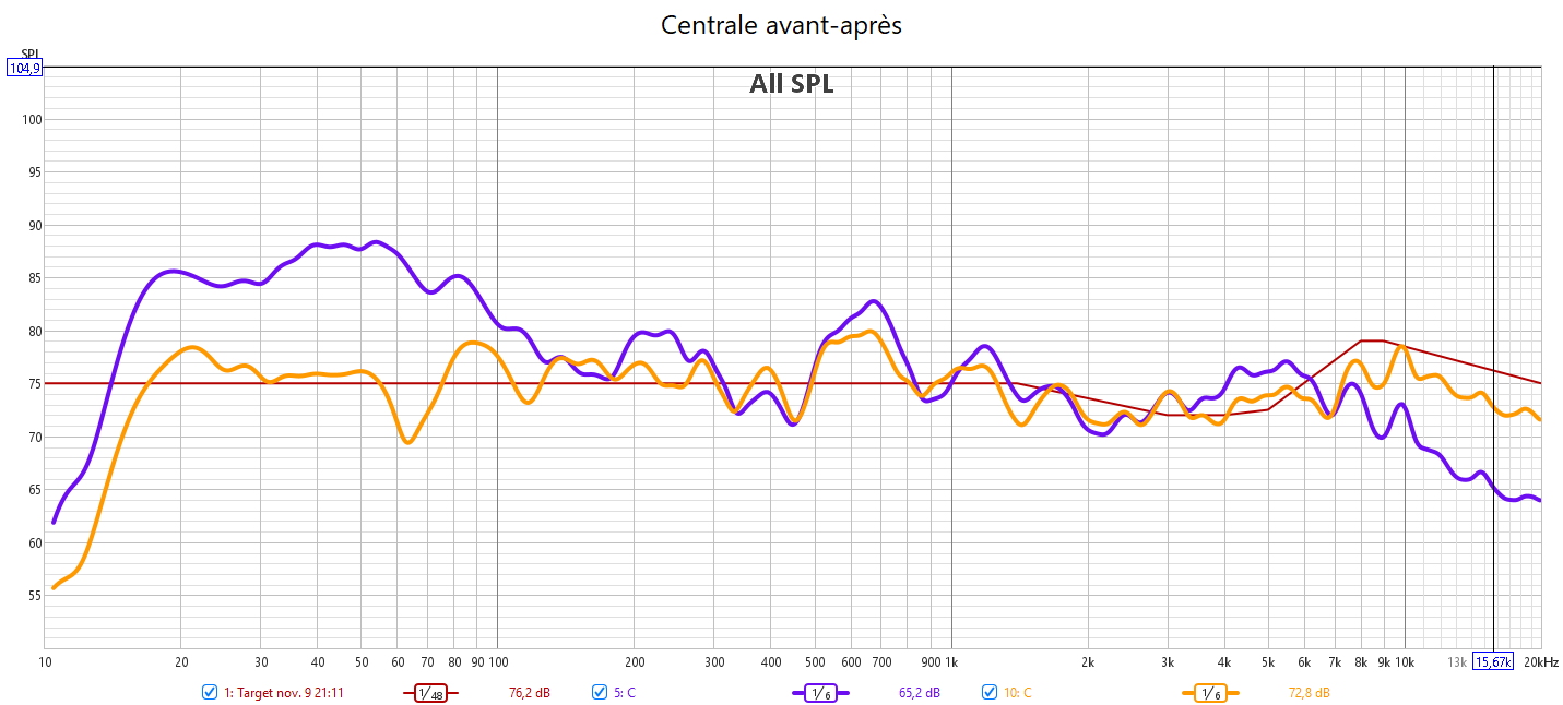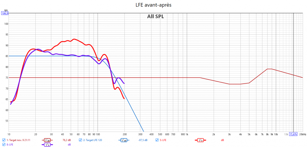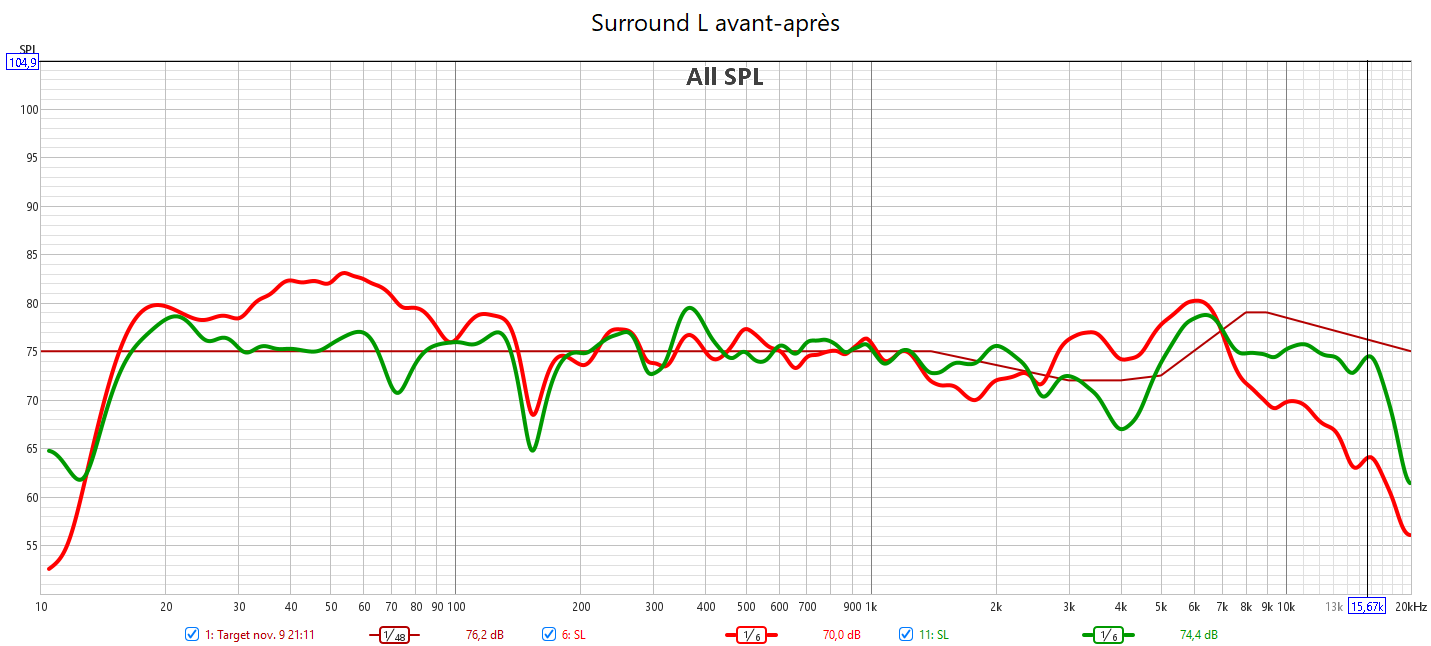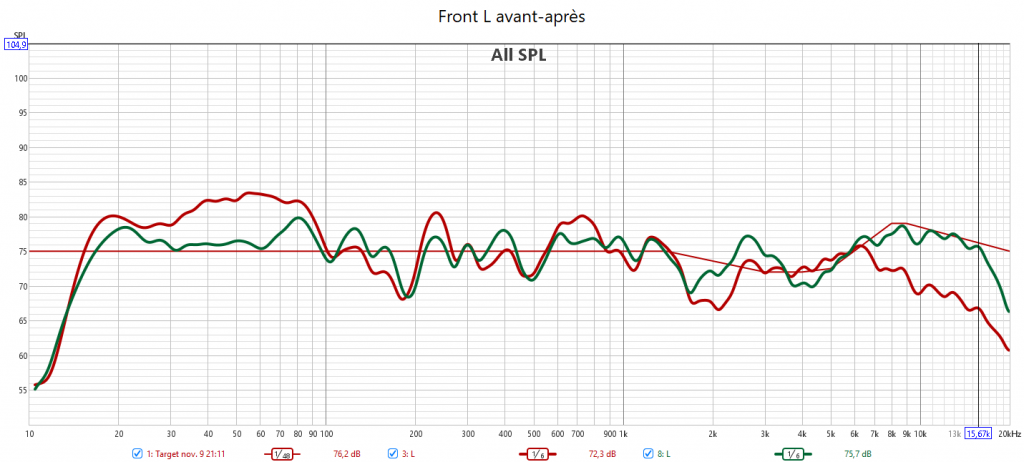 Après calibrage, la correction des enceintes s’est donc fait avec les égaliseurs graphiques 9 bandes. Le résultat est tout à fait bon avec le respect de la nouvelle courbe cible prenant en compte la sensibilité de l’oreille. L’aigu reste en retrait et l’extrême aigu est maintenant présent pour un rendu clair et précis sans agressivité. Les réponses sont alignées en niveau assurant l’équilibre de la bulle sonore. Le grave est plus linéaire grâce au DSP obligatoire ici en l’absence d’égalisage du LFE dans le Marantz.