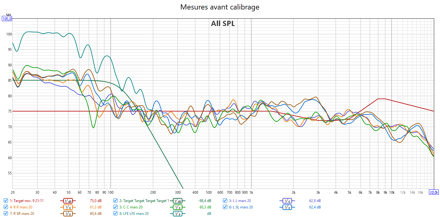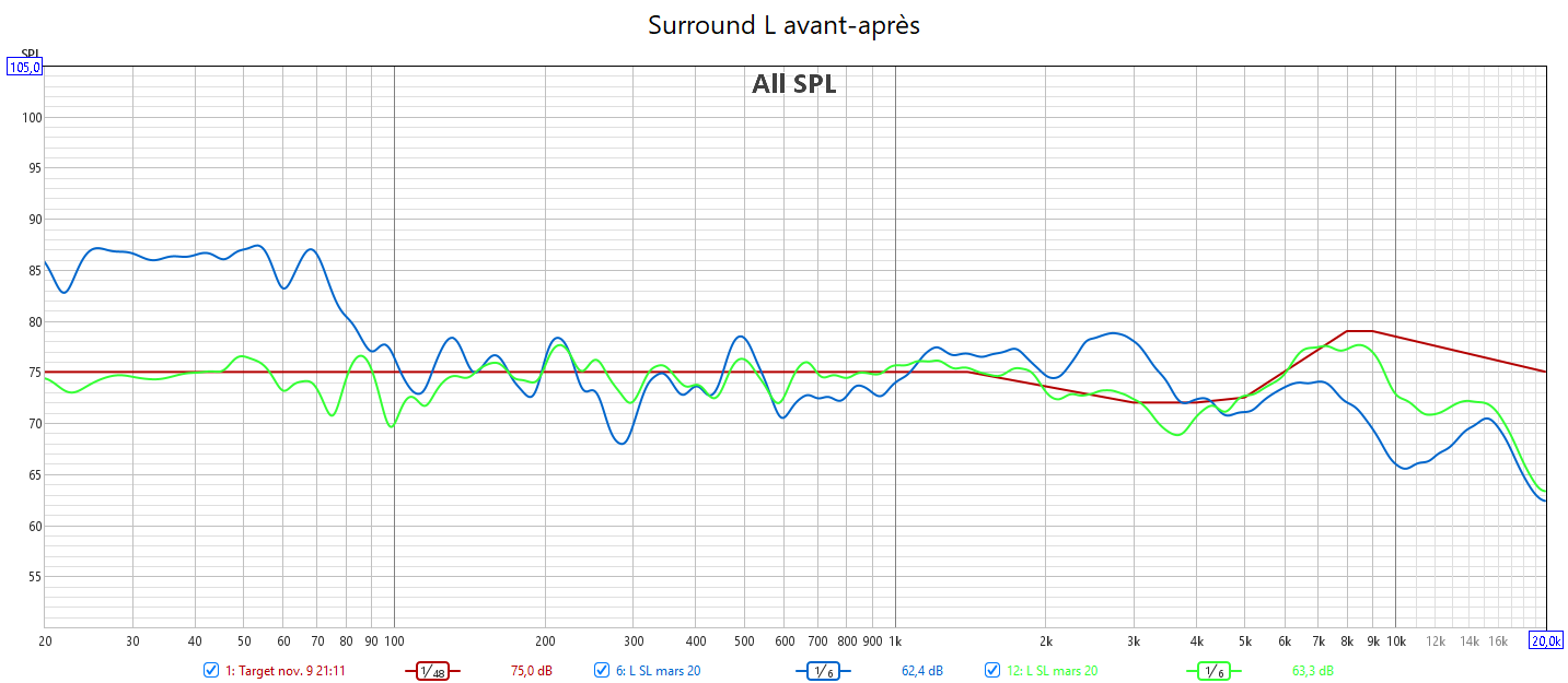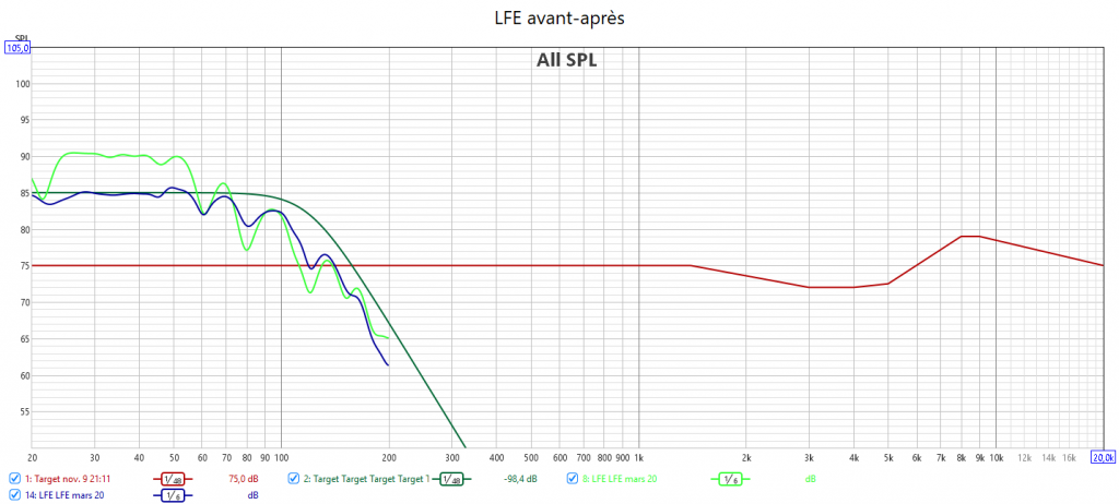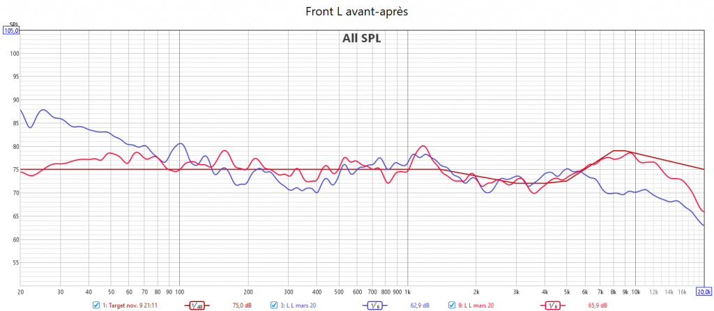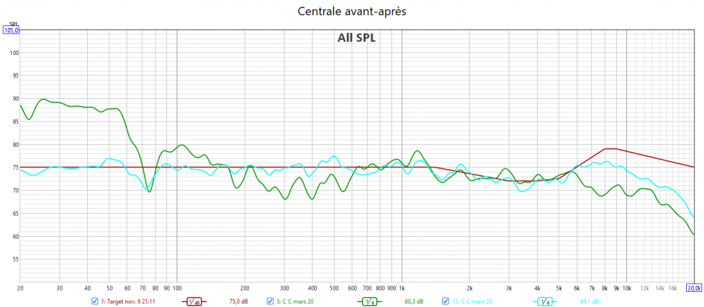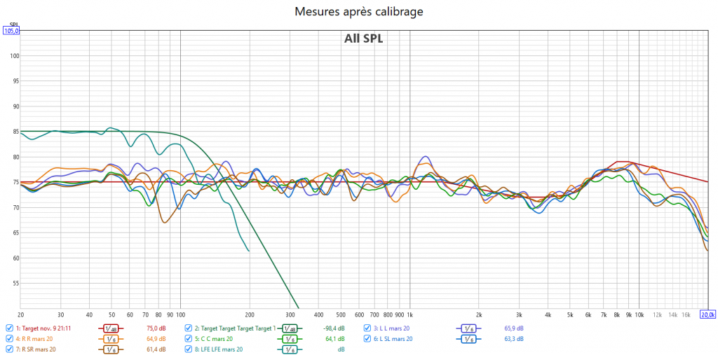 Après calibrage, la réponse de toutes les enceintes suit au mieux la courbe cible qui prend en compte la sensibilité de l’oreille suivant une extrapolation des courbes isosoniques. L’alignement est bon. La réponse du caisson est également meilleure. Elle chute un peu avant les 120 Hz, mais cela n’aura pas de conséquences à l’écoute. J’ai optimisé la mise en phase du caisson avec les enceintes. Il a fallu inverser la polarité des 2 frontales. L’alignement temporel est désormais sous les 0,5 ms. Donc une erreur inférieure à 17 cm . La précision est parfaitement suffisante.