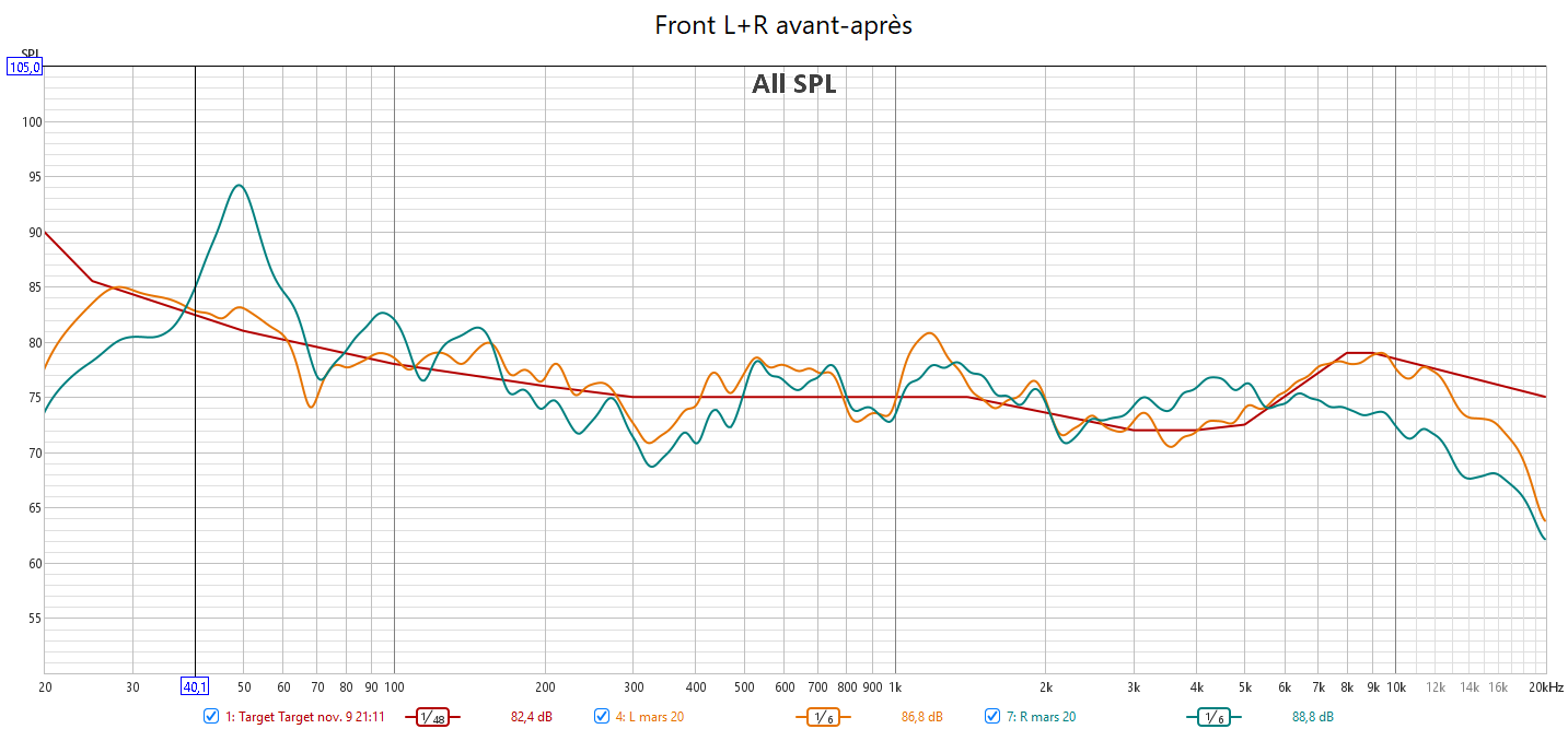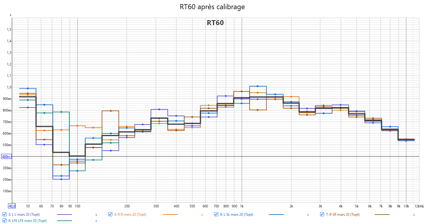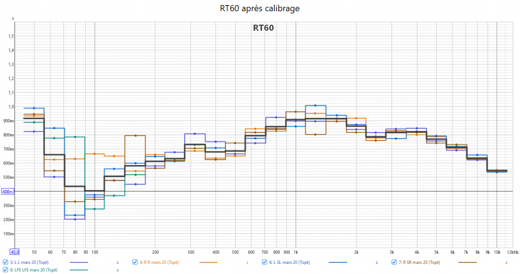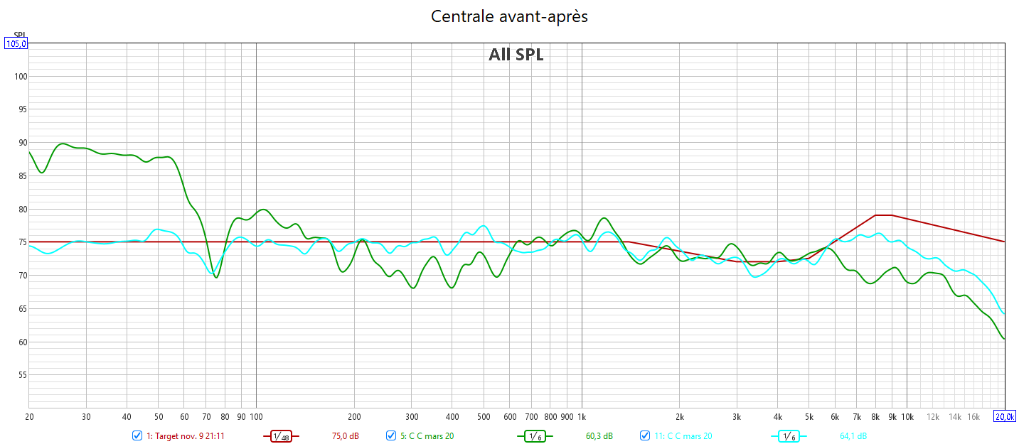 Après calibrage, la réponse de toutes les enceintes suit au mieux la courbe cible qui prend en compte la sensibilité de l’oreille suivant une extrapolation des courbes isosoniques. L’alignement est bon. La réponse du caisson est également meilleure. Elle chute un peu avant les 120 Hz, mais cela n’aura pas de conséquences à l’écoute. J’ai optimisé la mise en phase du caisson avec les enceintes. Il a fallu inverser la polarité des 2 frontales. L’alignement temporel est désormais sous les 0,5 ms. Donc une erreur inférieure à 17 cm . La précision est parfaitement suffisante.